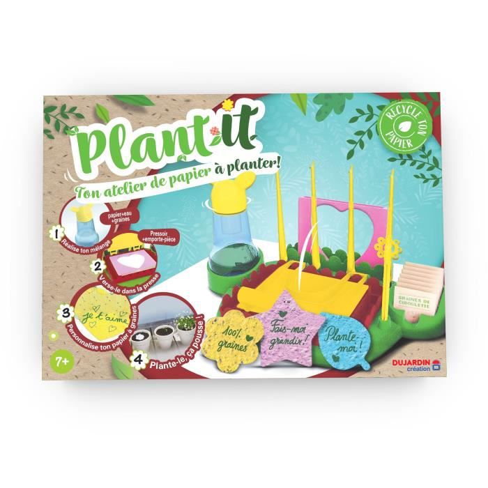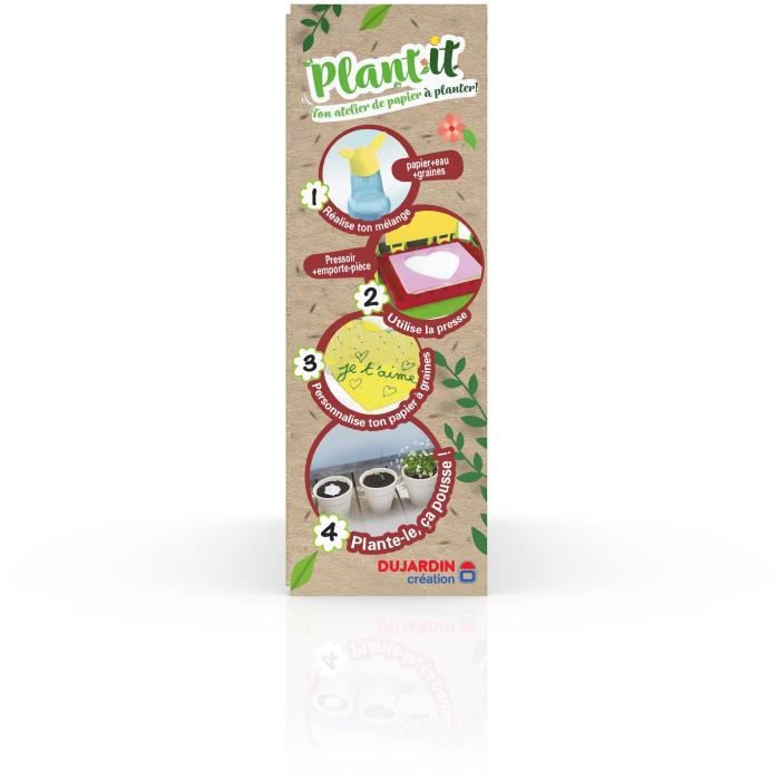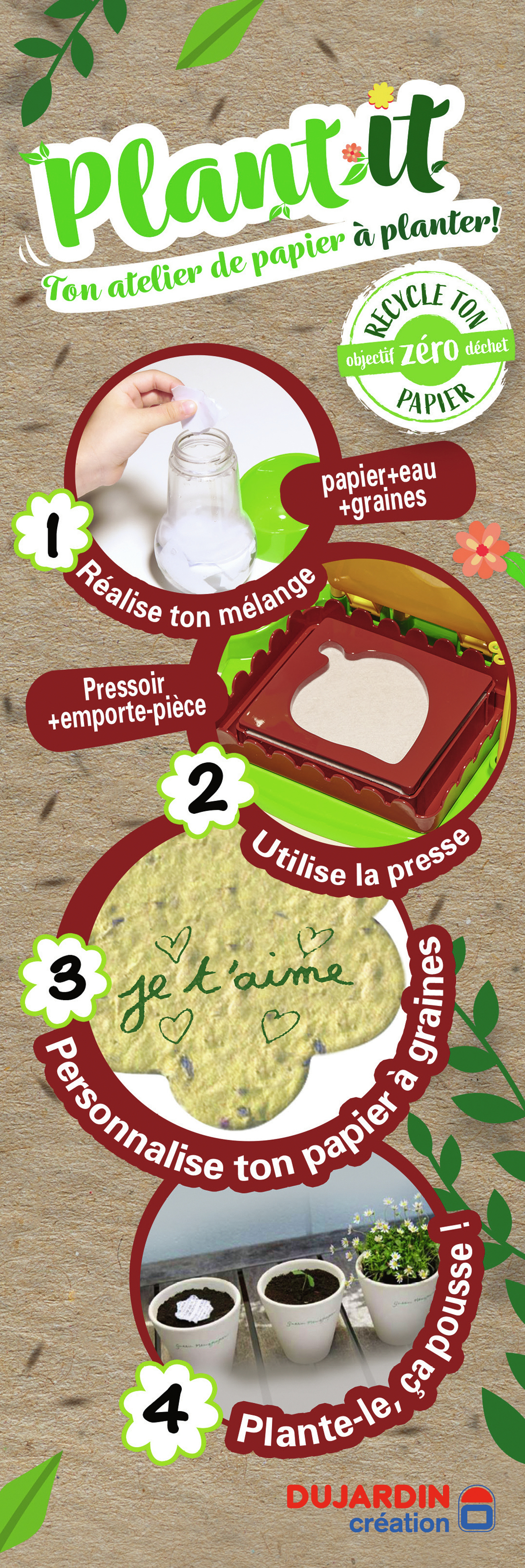 Avec ton atelier Plant It, crée ton papier à planter ! Recycle ton papier en le mélangeant avec de l'eau et des graines. Choisis, la forme, utilise la presse puis personnalise ton papier recyclé à planter et offre-le ! Génial, ça pousse !
