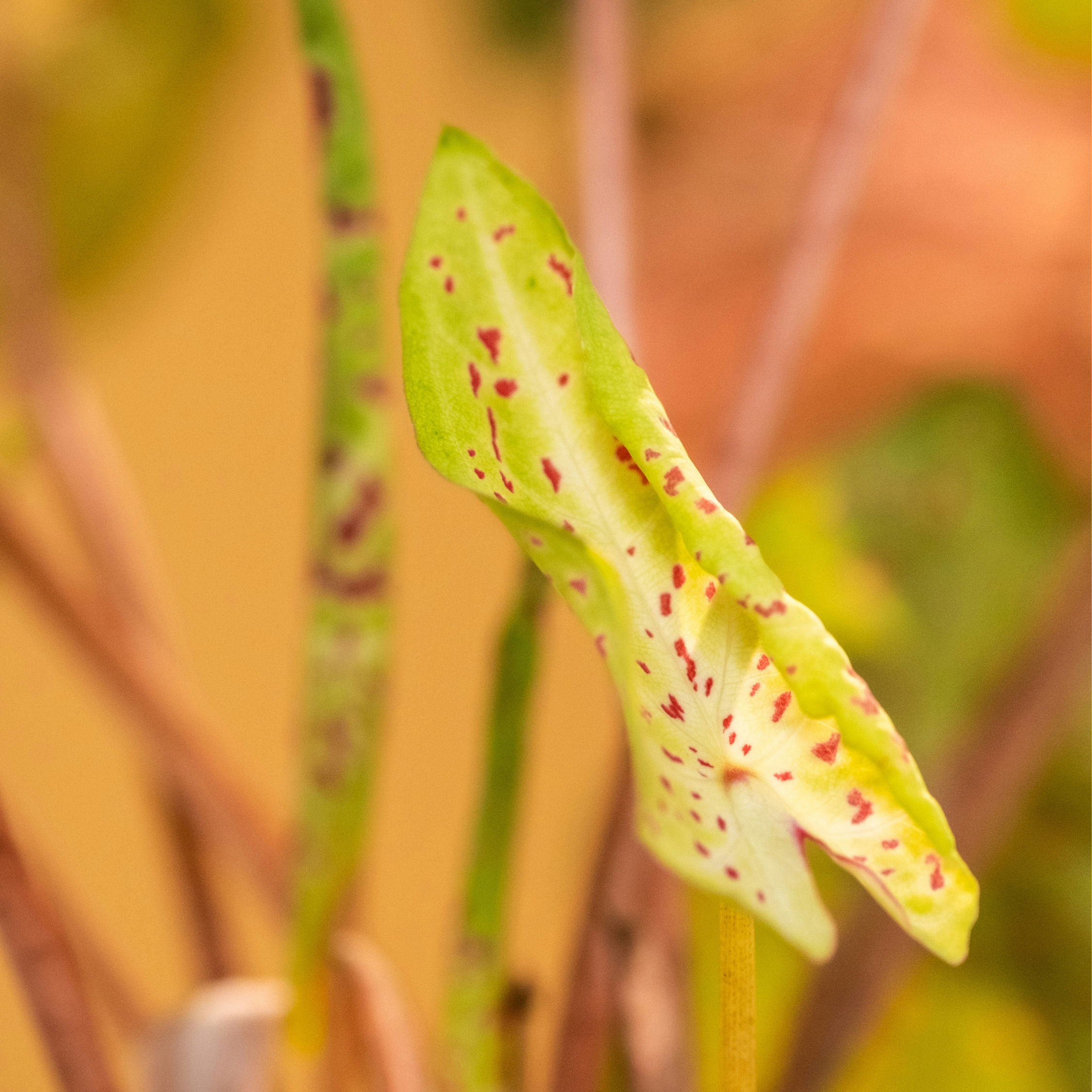 Le caladium est une plante inhabituelle originaire des jungles tropicales d'Amérique centrale et d'Amérique du Sud. Il existe une grande variété de couleurs et de motifs, certains plus impressionnants que d'autres. Le Caladium Miss Muffet a des feuilles vertes en forme de cœur avec des pointes roses. Les plantes entrent en hibernation en automne et perdent leurs feuilles pour renaître au printemps.