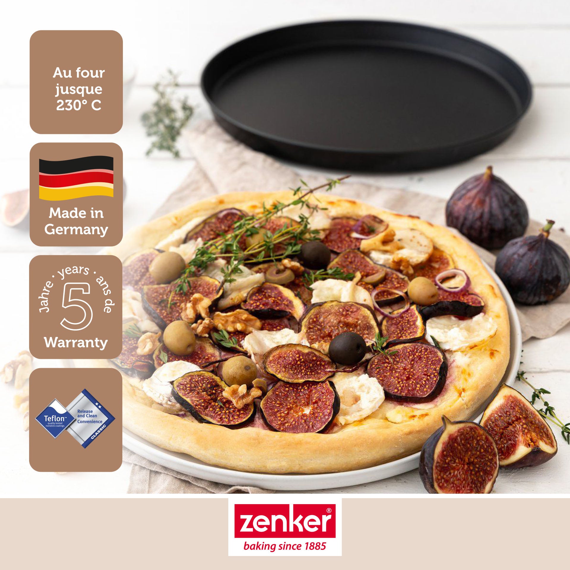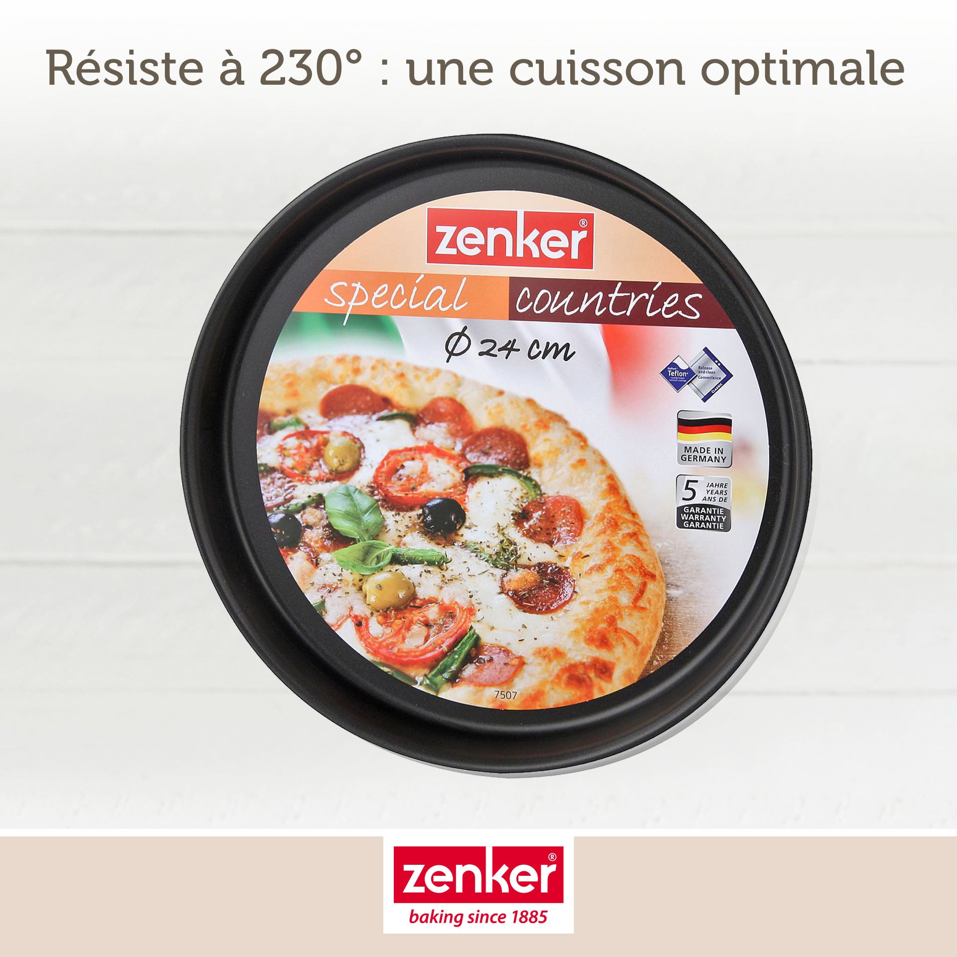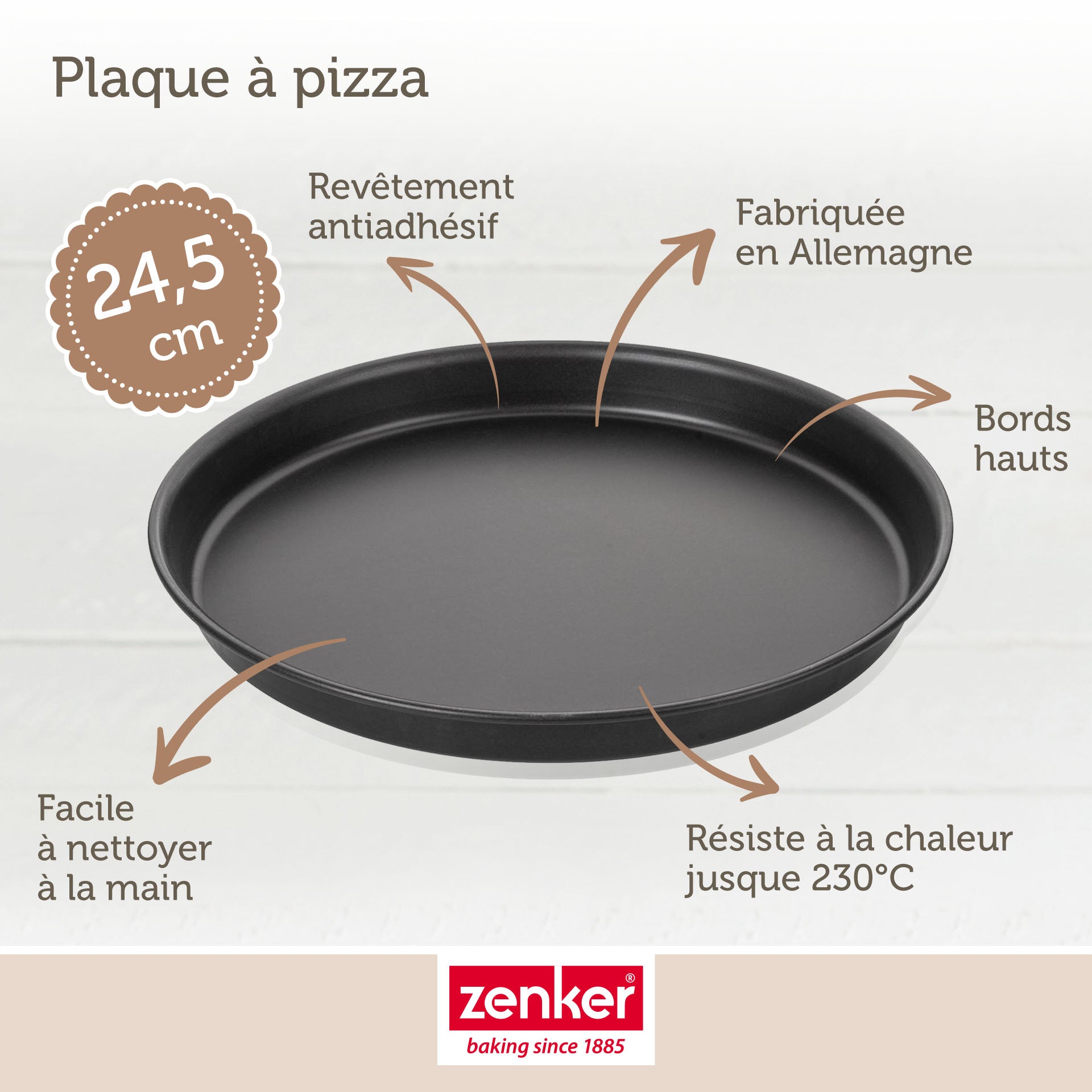 DESCRIPTION : Plaque à pizza de 24,5 cm de diamètre pour cuire vos pizzas maison LE PETIT + : Grâce aux bords hauts de la plaque à pizza le tour de votre pizza sera bien gonflé COMPOSITION : Acier avec un revêtement Téflon antiadhésif DIMENSIONS : 24,5 x 2,5 cm CONTENU : 1 plaque à pizza Cette plaque à pizzas ronde est idéale pour y cuire toutes vos pizzas et tartes flambées. Sur cette plaque à pizza vous pourrez notamment faire cuire une pizza 4 fromages, une pizza Regina, une pizza margherita, une pizza Hawaïenne, etc. Zenker est une marque faisant partie du groupe Fackelmann Brands et elle propose une large gamme d'ustensiles de pâtisserie et de moules à gâteaux. Concernant les ustensiles de pâtisserie, Zenker frappe fort en mettant à disposition des ustensiles de préparation mais aussi de décoration pour les pâtissiers confirmés. Côté moules à gâteaux c'est une marque pionnière qui propose des innovations telles que les moules à gâteaux en silicone et fibre de verre ne nécessitant pas de matière grasse et proposant des résultats de cuisson incroyables. Zenker possède donc une large gamme d'accessoires et d'ustensiles pour vous accompagner dans vos recettes du quotidien mais aussi pour des évènements exceptionnels comme les fêtes, les anniversaires, les mariages, etc.