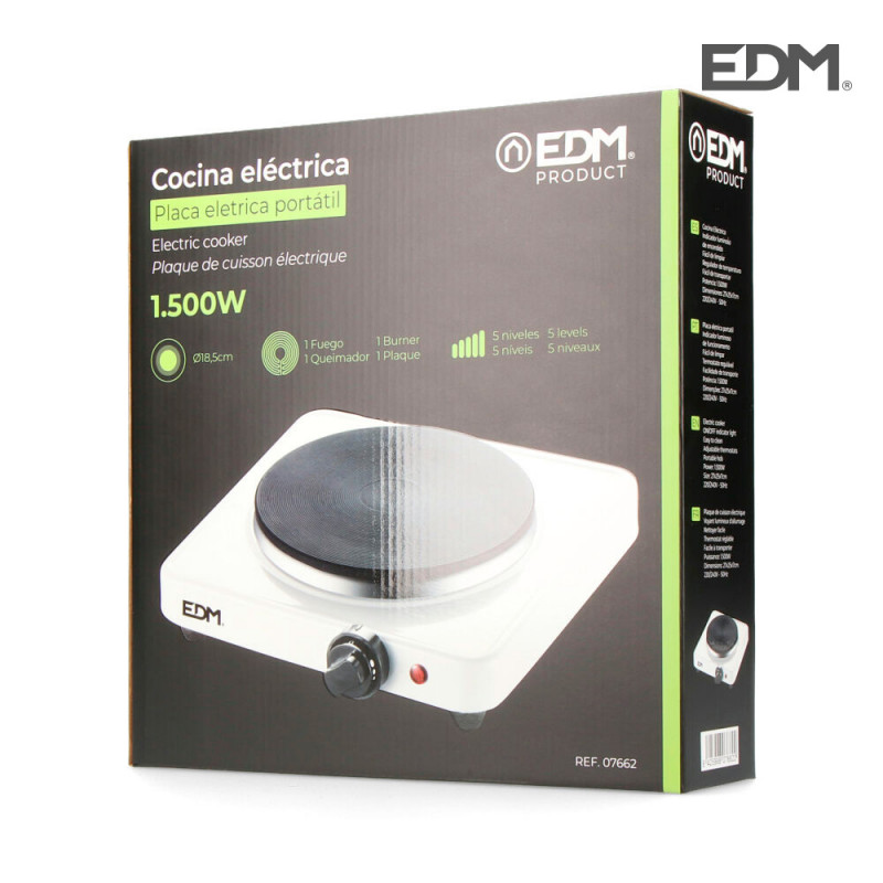 Passer le carrousel d'imagesLa plaque de cuisson électrique EDM dispose de 1 feu Ø 18.5 cm d'une puissance maxi de 1500 W. Elle est très pratique à utiliser au quotidien et vous permettra de cuisiner toutes sortes de plats. Puissante, vos plats seront cuits rapidement.