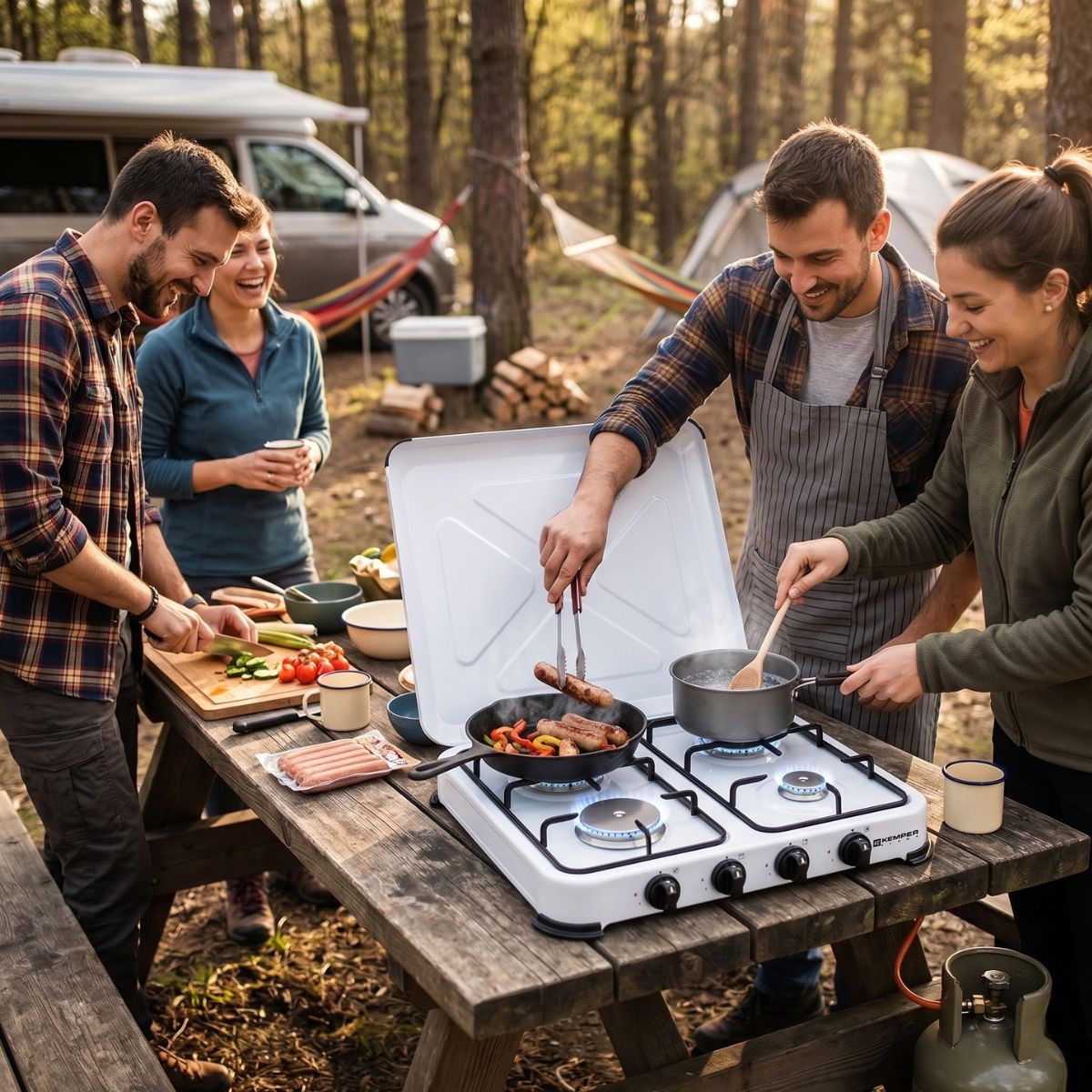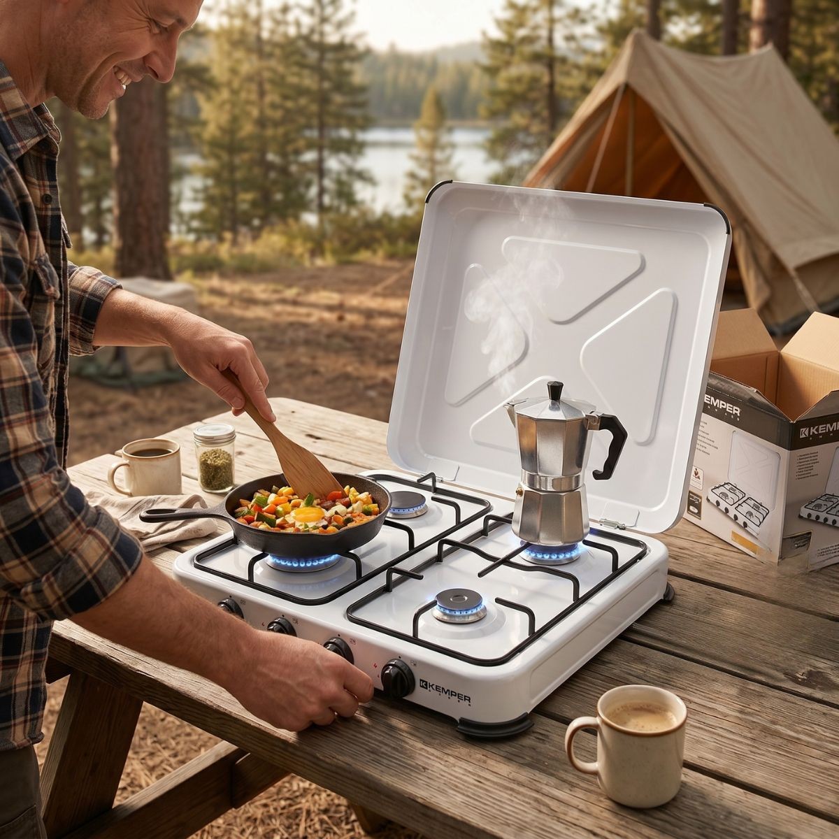 La plaque de cuisson gaz 4 feux KEMPER est la solution idéale pour cuisiner facilement dans un espace sans installation fixe, que ce soit sur votre balcon, au camping ou sur votre terrasse.