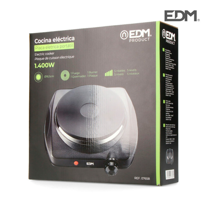 La plaque de cuisson électrique EDM dispose de 1 feu Ø 18.5 cm d'une puissance maxi de 1400 W. Elle est très pratique à utiliser au quotidien et vous permettra de cuisiner toutes sortes de plats. Puissante, vos plats seront cuits rapidement.
