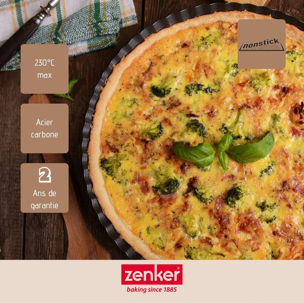DESCRIPTION : Zenker vous propose ce moule à tarte de 26 cm de diamètre idéal pour préparer des tartes sucrées, des tartes salées ou des quiches LE PETIT + : Ce plat à tarte peut également vous servir de plat à pizza ce qui le rend parfaitement polyvalent et adapté à la cuisine quotidienne COMPOSITION : Ce moule à tarte est composé en acier carbone avec un revêtement super antiadhésif qui facilite à la fois le démoulage de la tarte et le nettoyage DIMENSIONS : Le moule tarte mesure 26 cm de diamètre ce qui est très pratique pour préparer une tarte salée pour 6 personnes, les bords sont hauts de 3 cm UTILISATION : Ce plat à tarte passe au four jusqu'à 230°C, parfait pour de bonnes tartes sucrées ou salées, le moule tarte ne passe pas au lave-vaisselle Zenker est une marque faisant partie du groupe Fackelmann Brands et elle propose une large gamme d'ustensiles de pâtisserie et de moules à gâteaux. Concernant les ustensiles de pâtisserie, Zenker frappe fort en mettant à disposition des ustensiles de préparation mais aussi de décoration pour les pâtissiers confirmés. Côté moules à gâteaux c'est une marque pionnière qui propose des innovations telles que les moules à gâteaux en silicone et fibre de verre ne nécessitant pas de matière grasse et proposant des résultats de cuisson incroyables. Zenker possède donc une large gamme d'accessoires et d'ustensiles pour vous accompagner dans vos recettes du quotidien mais aussi pour des évènements exceptionnels comme les fêtes, les anniversaires, les mariages, etc.