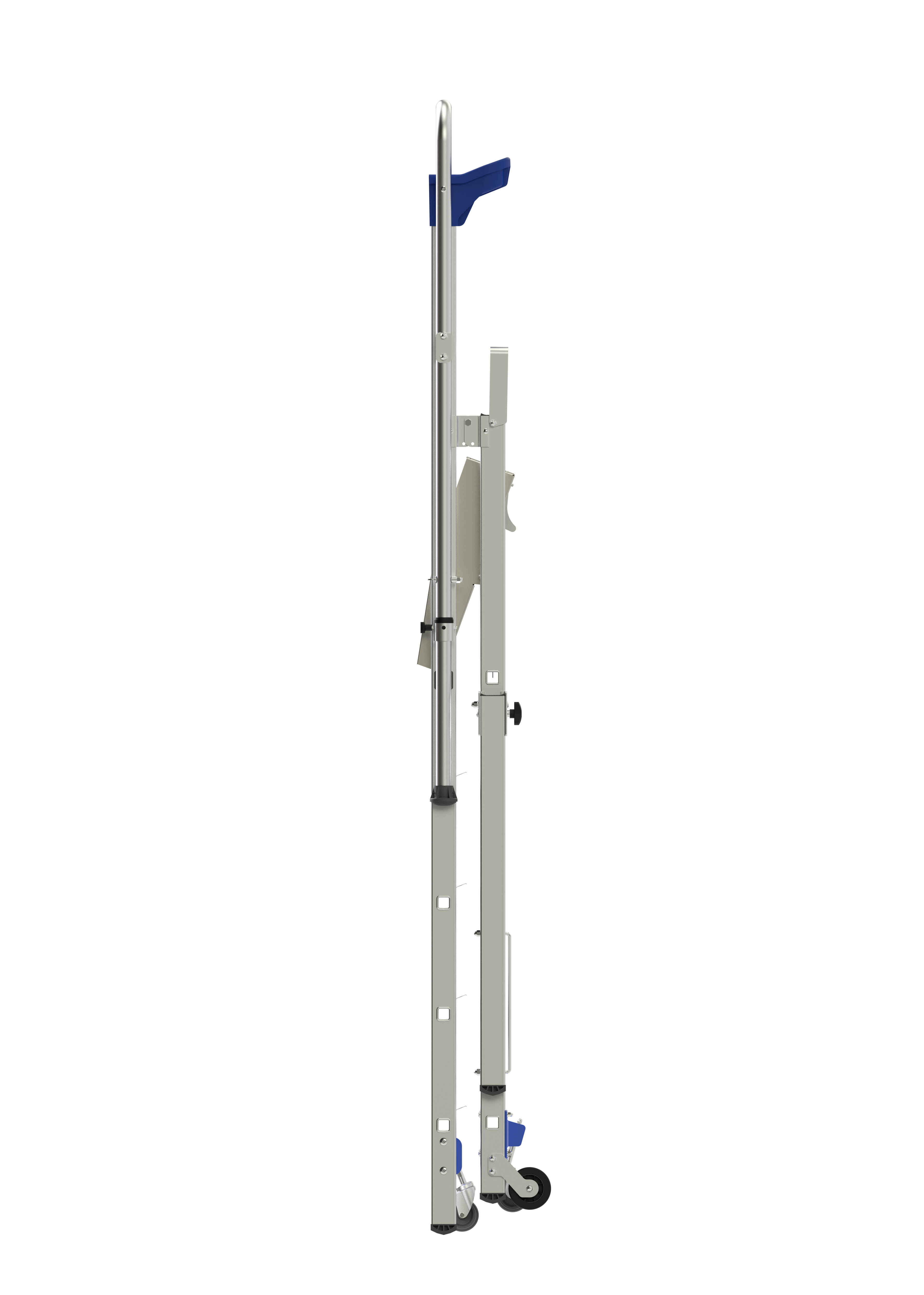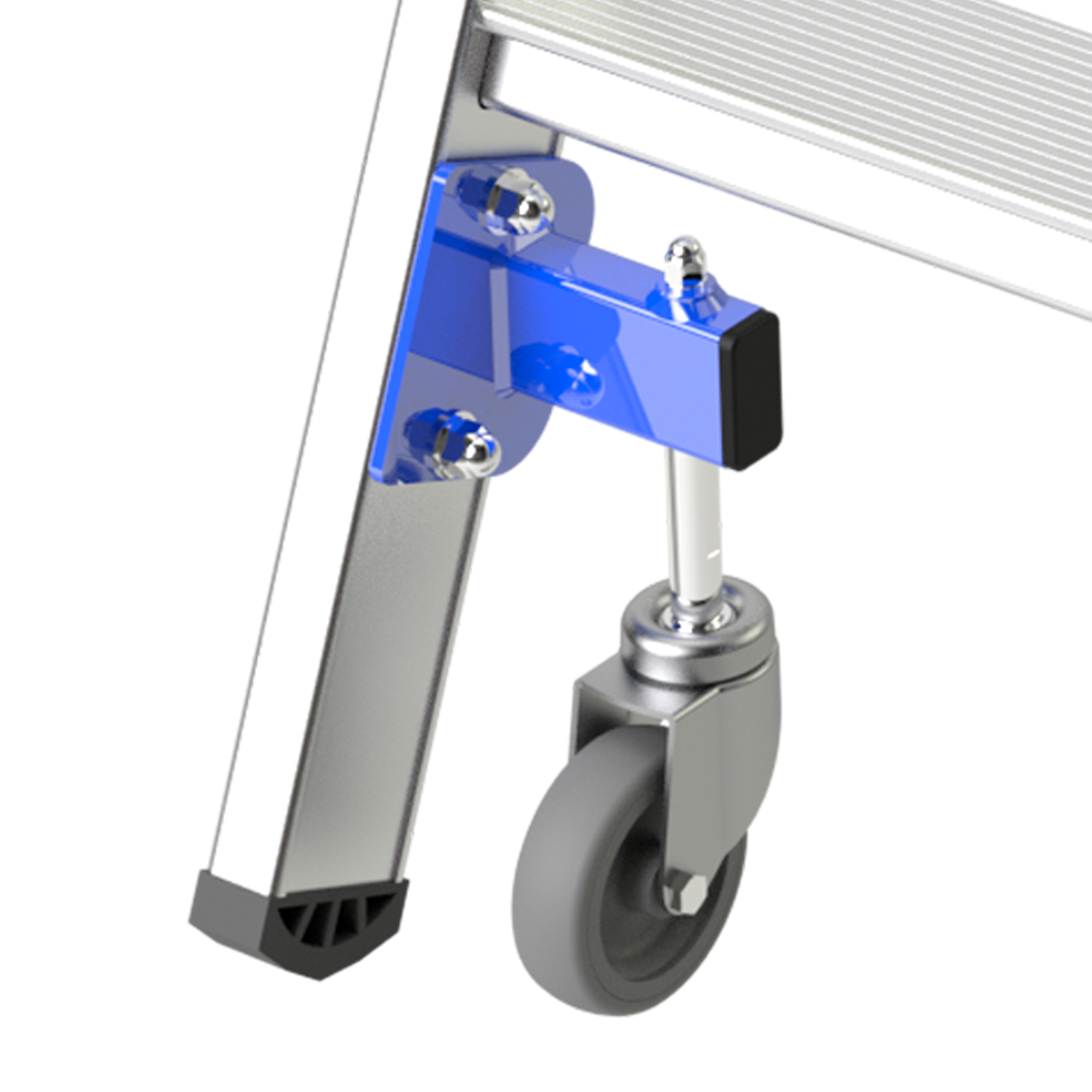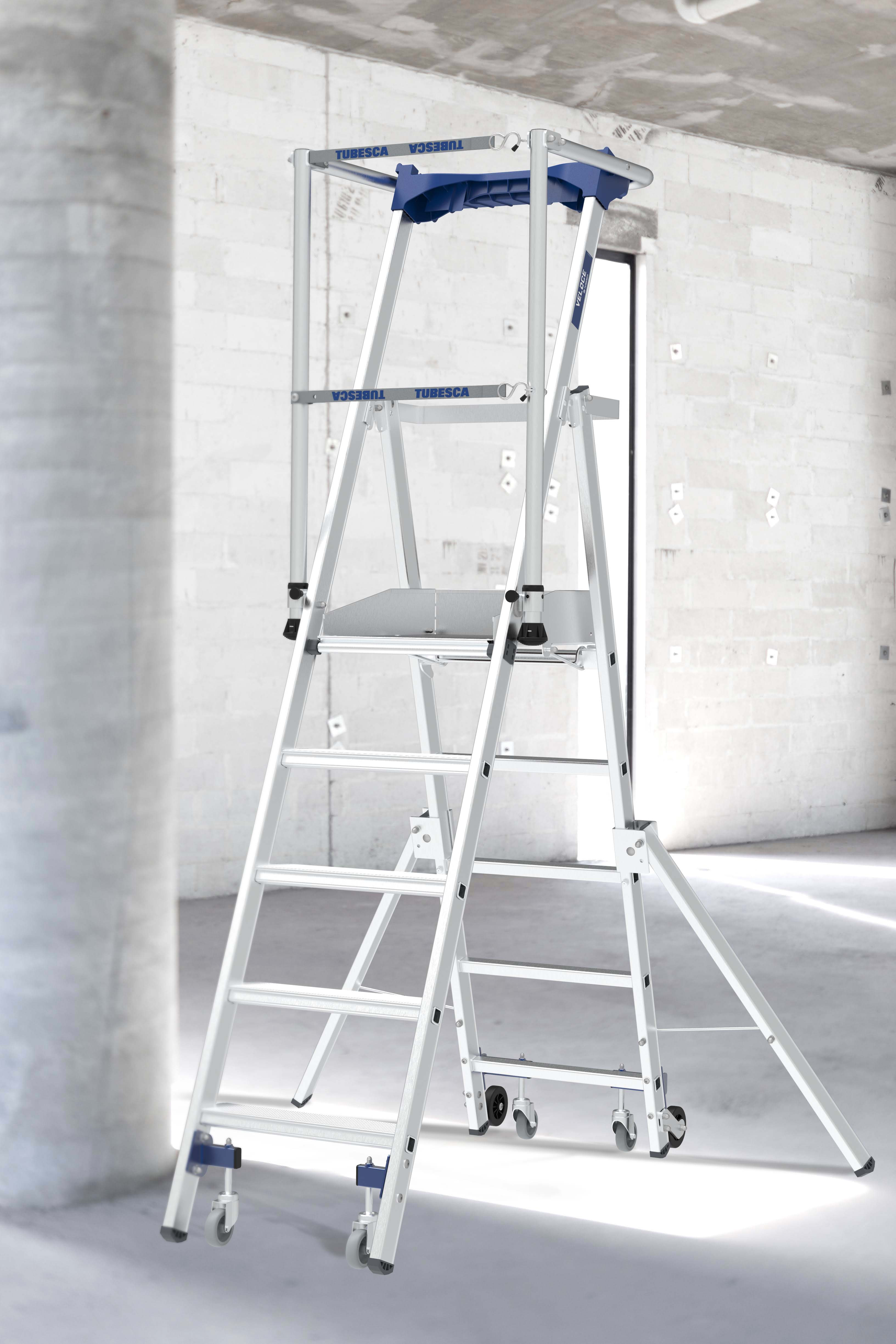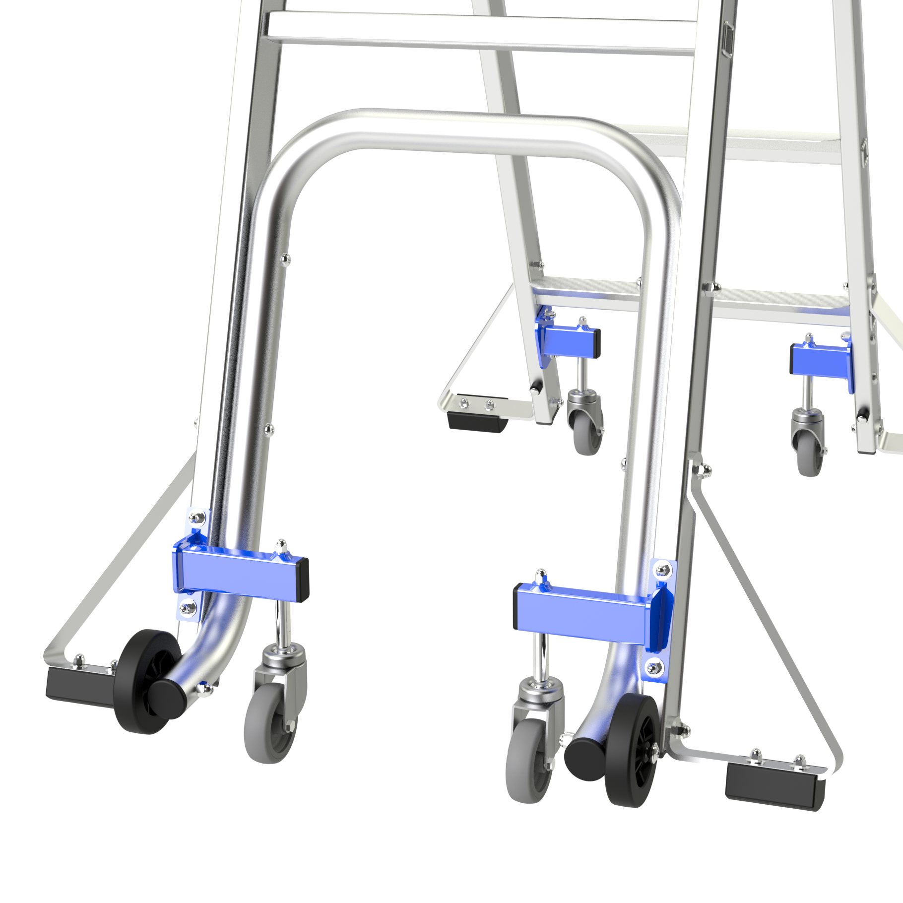 La plate-forme de travail la plus légère du marché version ultra-mobile. Avec ses roues escamotables, elle permet des déplacements sans aucun effort même déployée, pour aller d'une zone de travail à une autre sans être portée. Sécurisée, les 4 roues se rétractent dès l'accès à la première marche. Disponible du 2 au 7 marches. La gamme répond à la norme européenne EN 131-7, au décret 2004-924 et à la norme PIRL 93 353 (hors 7 marches)