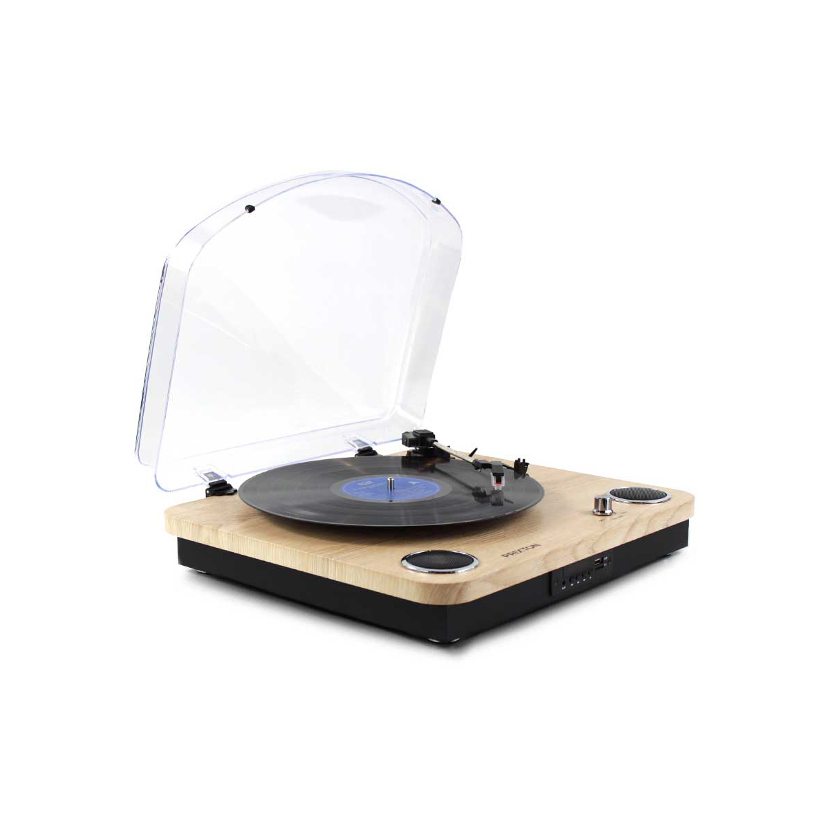 - Entrée Bluetooth. Elle fonctionne comme un haut-parleur. Activez le Bluetooth du tourne-disque et connectez vos dispositifs. Reproduisez votre musique au volume que vous souhaitez. Elle intègre deux haut-parleurs stéréo.