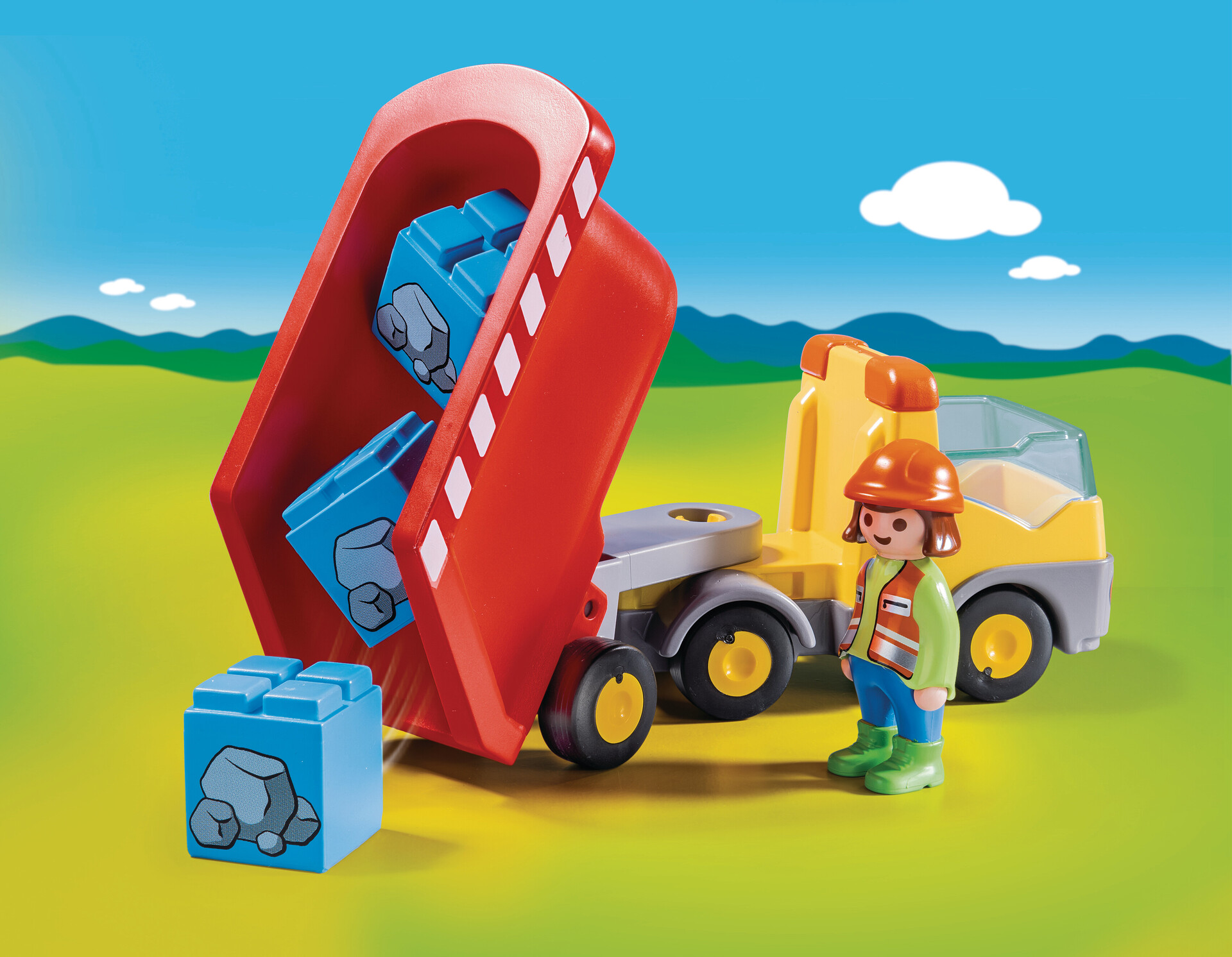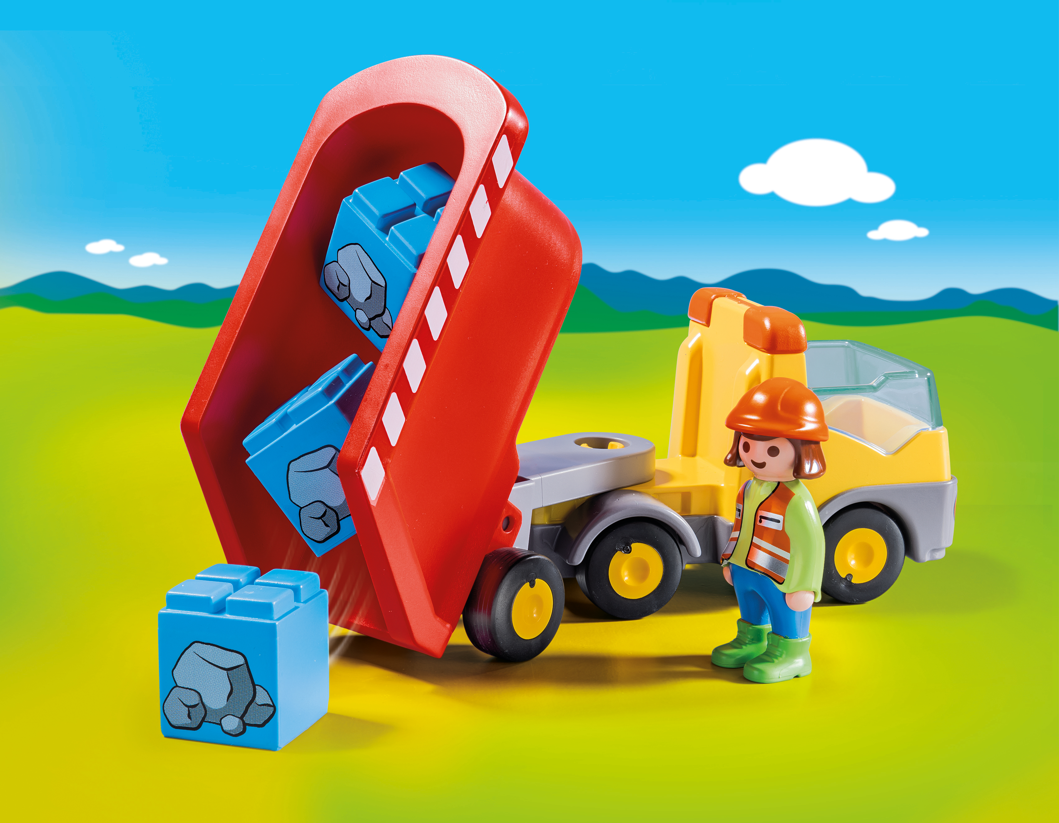 L'ouvrier en bâtiment transporte les blocs de béton grâce à son camion à benne inclinable. Dimensions : 19 x 7 x 10 (LxPxH) PLAYMOBIL® 1.2.3 - les tout petits voient grand ! Les PLAYMOBIL 1.2.3 sont colorés avec des formes arrondies, ils aident les enfants à se développer et à apprendre en jouant.