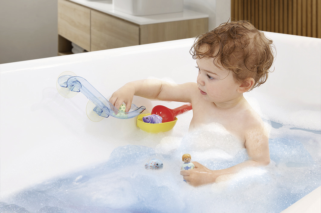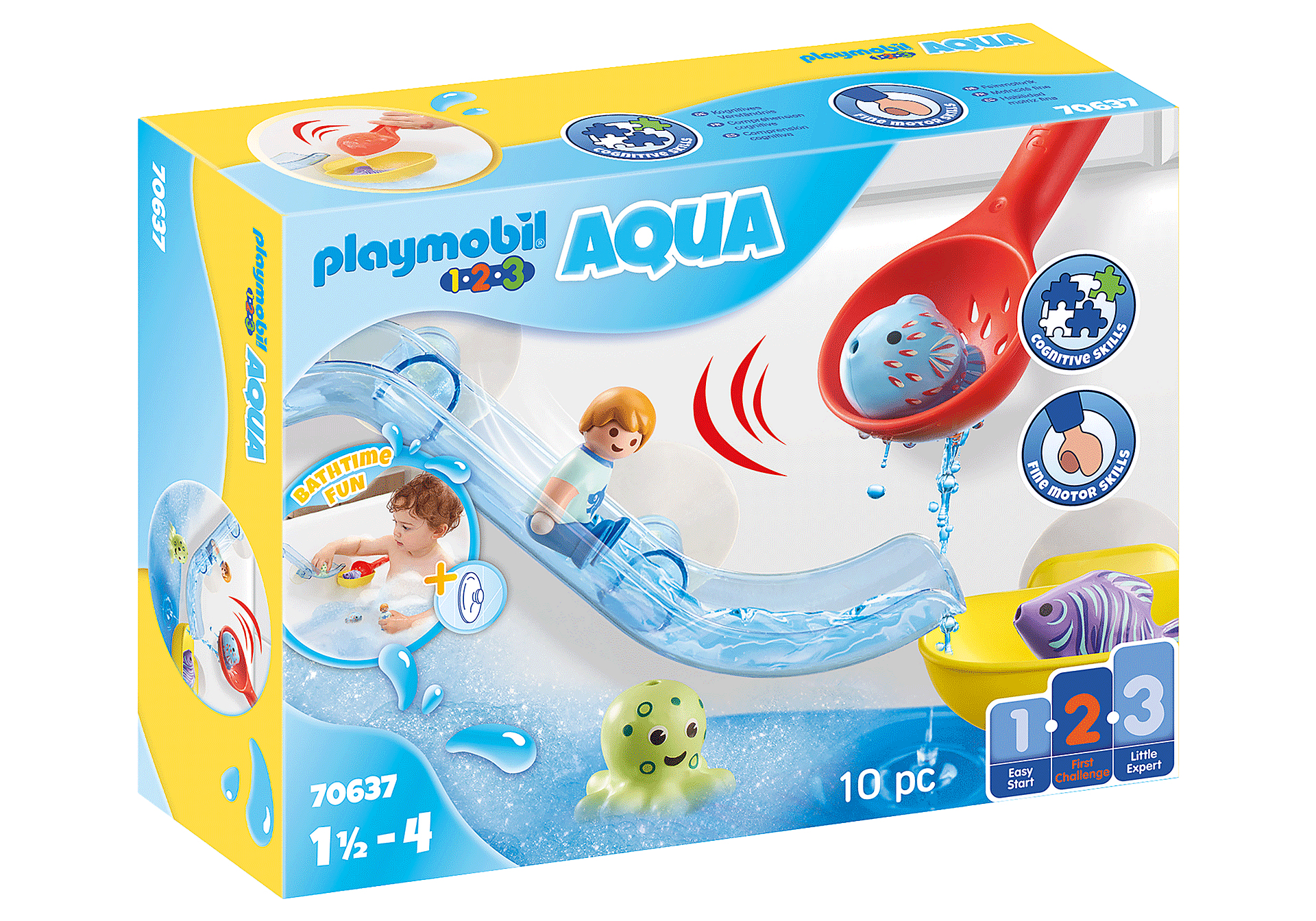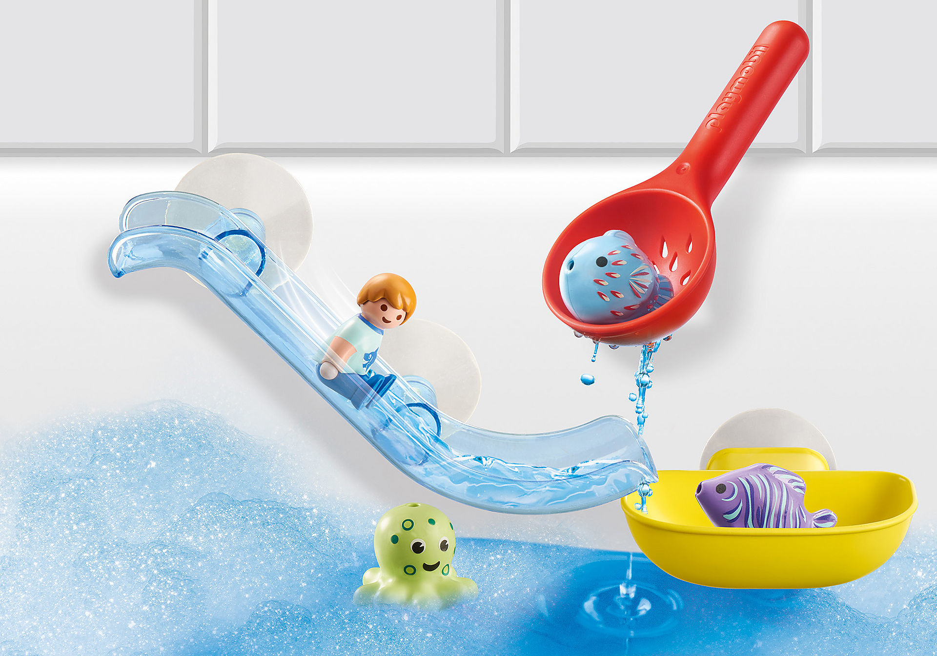 | Plus produit | Avec les nouveaux PLAYMOBIL 1.2.3 AQUA, profitez de bons moments avec votre tout-petit !\nLe toboggan ainsi que la plateforme de réception peuvent être fixés aux parois de la baignoire à l\'aide des ventouses.\nUne fois que toutes les créatures marines ont été attrapées, elles peuvent glisser dans le toboggan. |