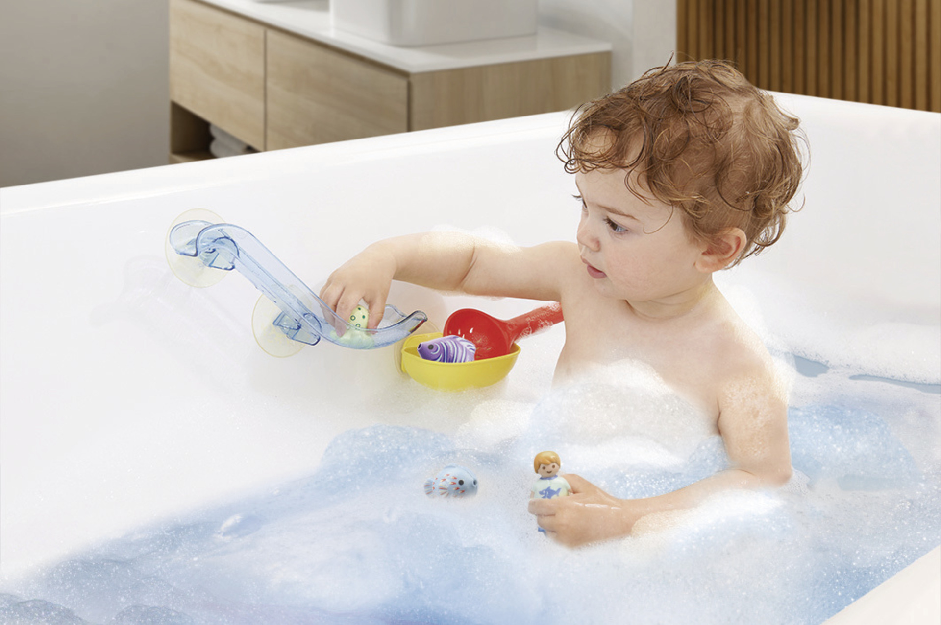 Pêcher, attraper, s'amuser ! Avec le grand toboggan PLAYMOBIL et les animaux marins, une bonne dose de joie garantie ! Mettez d'abord les poissons dans la baignoire puis repêchez-les à l'aide de l'épuisette. Une fois que toutes les créatures marines ont été attrapées, elles peuvent glisser dans le toboggan. Le toboggan ainsi que la plateforme de réception peuvent être fixés aux parois de la baignoire à l'aide des ventouses.
