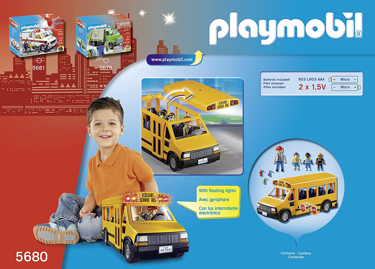 PLAYMOBIL 5680 AUTOBUS DE TRANSPORT SCOLAIRE JAUNE Prenez place dans le bus scolaire qui vous amènera à l'école, le toit s'ouvre, avec gyrophare, piles incluses. Avec 4 personnages. Contient 12 pièces NE CONVIENT PAS AUX ENFANTS DE MOINS DE 4 ANS ! PETITES PIECES RISQUE D'ETOUFFEMENT !!