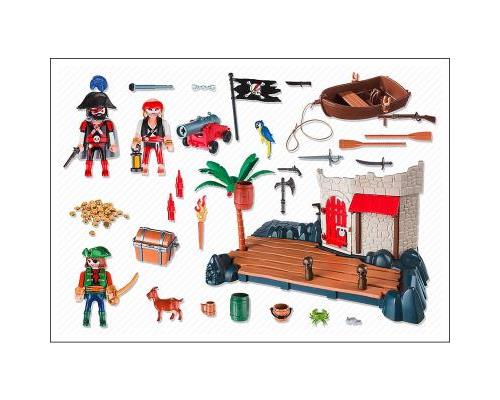 | La boîte contient | - un îlot des pirates - 3 pirates - 1 barque - des armes (canon avec projectiles, épées, fusils, revolvers...) - de nombreux accessoires (coffre au trésor, barils, dynamite...) |