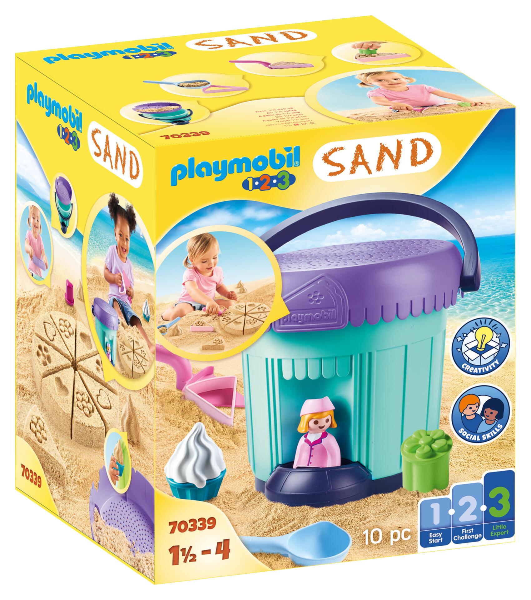 Plus produit - Les seaux et accessoires peuvent être utilisés en intérieur et en extérieur. - Un personnage PLAYMOBIL 1.2.3 peut être placé dans le seau. - Le seau peut également être utilisé comme moule pour faire des pâtés de sable.\n- Capacité du seau : 1,7 L. Dimensions : 19x18x16cm (LxPxH). - Toutes les pièces peuvent être rangées dans le seau et el tamis peut être utilisé comme couvercle.\n- Le tamis peut également être utilisé comme plateau pour les parts de gâteau de sable. La surface du tamis n\'est pas suffisante pour contenir un gâteau entier. \n- Les tampons peuvent être utilisés des deux côtés pour permettre d\'imprimer différents motifs.\n- Les moules à cupcakes peuvent être utilisés individuellement ou en combinaison. \n\nPour façonner et décorer des morceaux de gâteau : \n- Remplir la pelle à gâteau de sable avec la cuillère. \n- Tasser le sable puis décorer la part de gâteau à l\'aide d\'un tampon. \n- Démouler délicatement la part de gâteau. \n- Poursuivre cette manoeuvre jusqu\'à l\'obtention d\'un gâteau complet (8 parts). \n- Les moules à cupcake et les moules pour garnir les cupcakes peuvent être utilisés ensemble ou séparément. \n