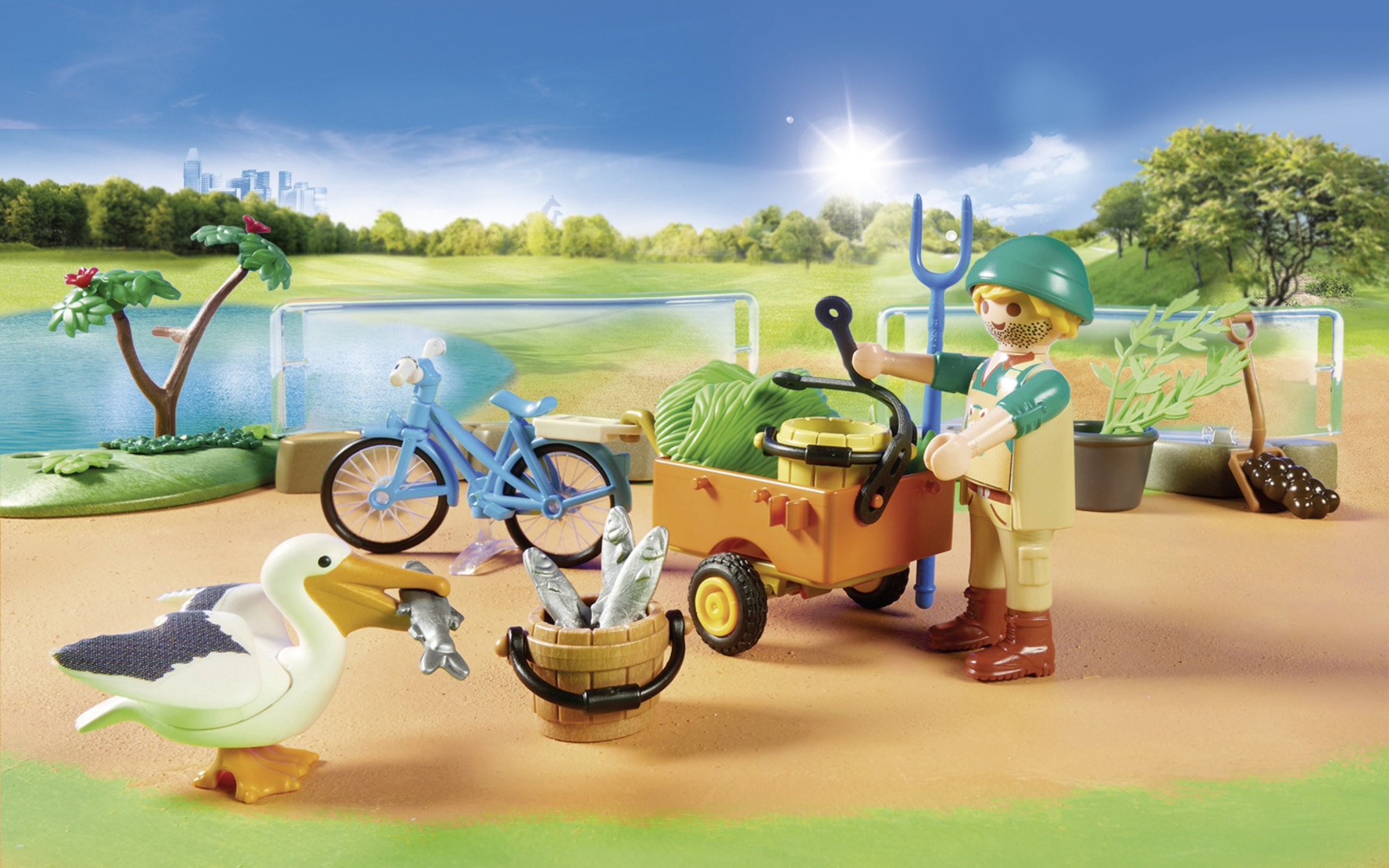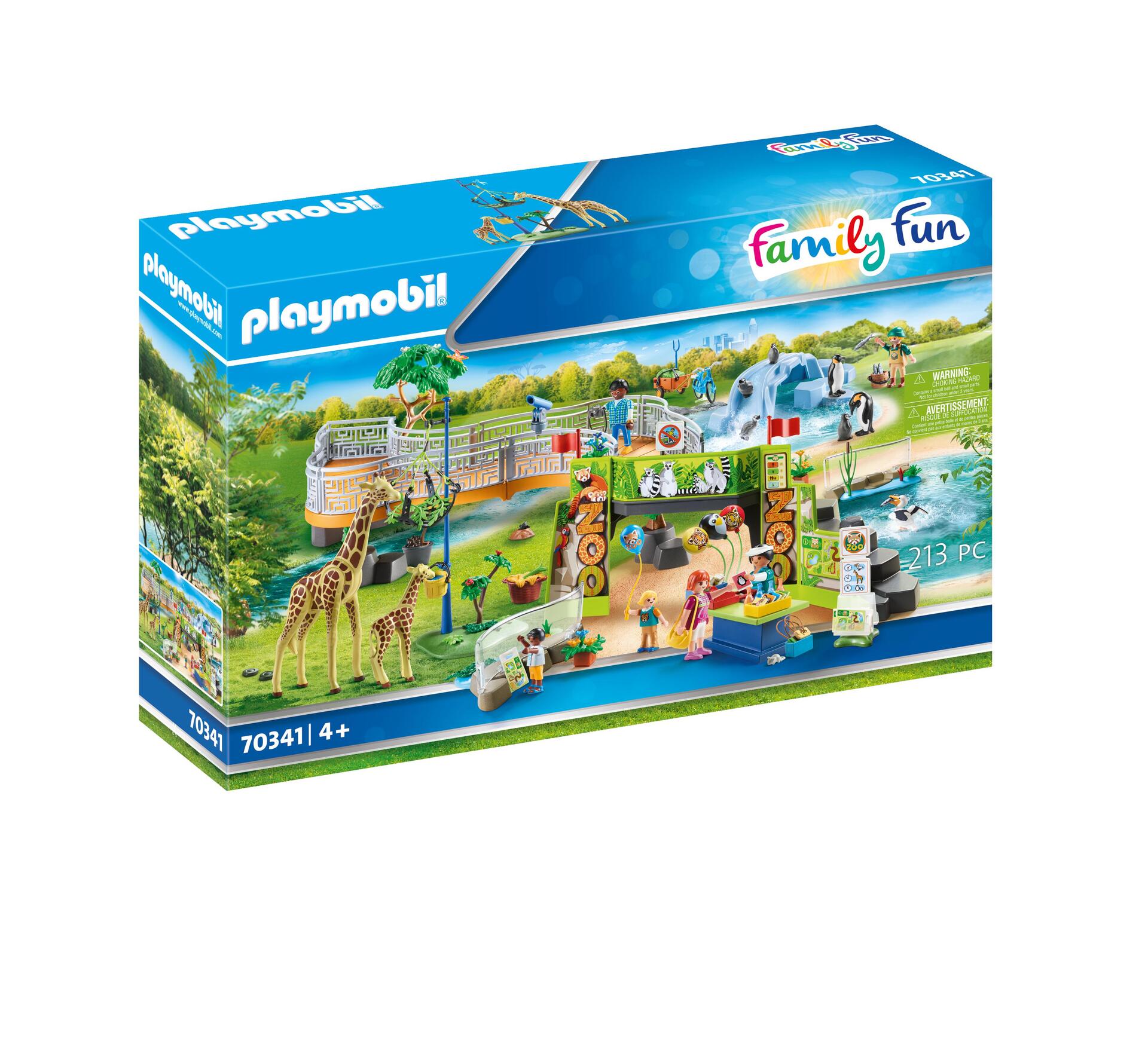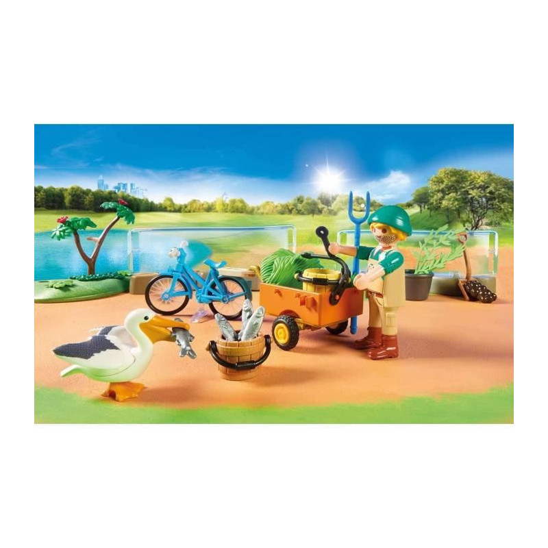 | Plus produit | - Le Parc animalier peut être organisé de la manière souhaitée et dispose de nombreuses possibilités d\'extensions.\n- La voûte rocheuse fait office de portail d\'entrée. - Souvenirs, plan du parc, bonbons et boissons peuvent être achetés à la caisse du parc. - L\'horloge réglable indique les heures auxquelles les animaux doivent être nourris.\n- Le télescope peut être pivoté et incliné dans toutes les directions. - Les enclos pour animaux peuvent être organisés de manière flexible à l\'aide des éléments de délimitation.\n- Le bassin des pingouins contient un toboggan et une banquise.\n- L\'enclos des girafes contient un point d\'alimentation adaptable aux différentes hauteurs des animaux. - Inclus : Un gardien d\'animaux avec un vélo et une remorque pour le transport de la nourriture et du matériel de nettoyage. - Le Parc animalier peut être combiné et étendu avec l\'Enclos (Ref. 70347), l\'Extension pour parc animalier (Ref. 70348) et la Famille de lions avec végétation (Ref. 70343). |