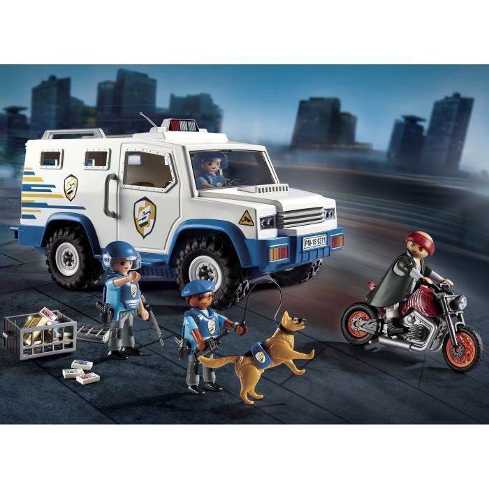 | Libellé | PLAYMOBIL 9371 Fourgon blindé avec convoyeurs de fonds, Contient 1 fourgon blindé, 3 personnages, 1 moto et de nombreux accessoires, Dimensions : Ap |