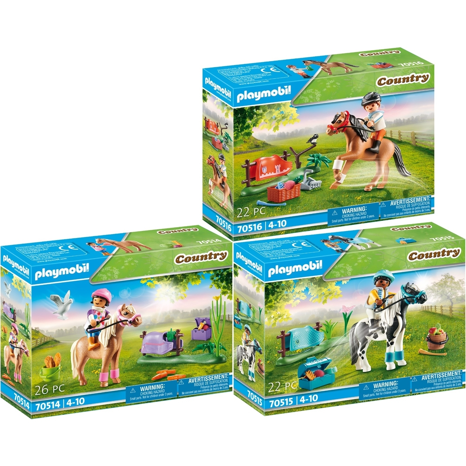 Lot de 3 articles Playmobil – Country – 70514+70515+70516 - - Cet ensemble se compose des articles suivants : - - Playmobil Country 70514 Cavalière et poney islandais - - La petite fille prend bien soin de son poney Islandais. La boîte violette contient plusieurs accessoires pour ce dernier. Un petit coup de brosse et on part faire une balade ! Contient un personnage et un poney. - - Contient: - 26 pièces - À partir de : 4 ans - - Playmobil Country 70515 Cavalier et poney Lewitzer - - Le petit garçon prend bien soin de son poney Lewitzer. La boîte bleue contient plusieurs accessoires pour ce dernier. Un petit coup de brosse et on part faire une balade ! Contient un personnage et un poney. - - Contient: - 22 pièces - À partir de : 4 ans - - Playmobil Country 70516 Cavalier et poney Connemara - - Le petit garçon prend bien soin de son poney Connemara. La boîte rouge contient plusieurs accessoires pour ce dernier. Un petit coup de brosse et on part faire une balade ! Contient un personnage et un poney. - - Contient: - 22 pièces - À partir de : 4 ans - -