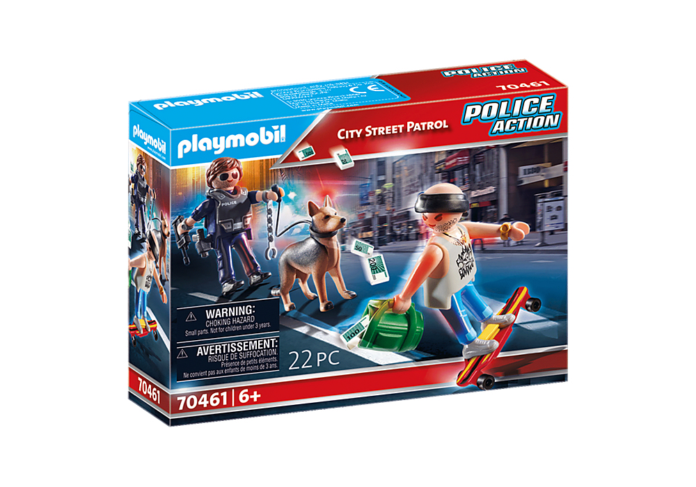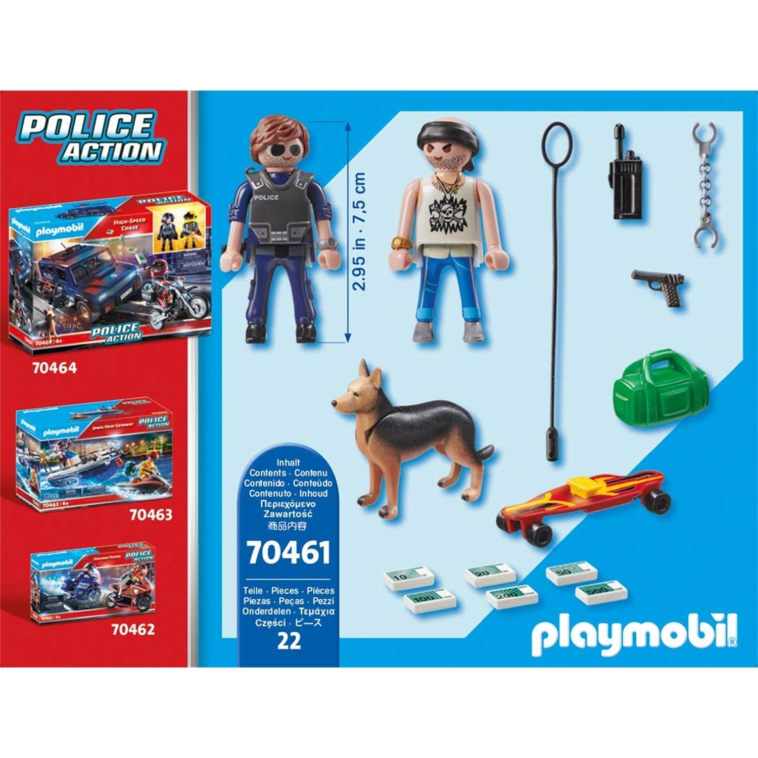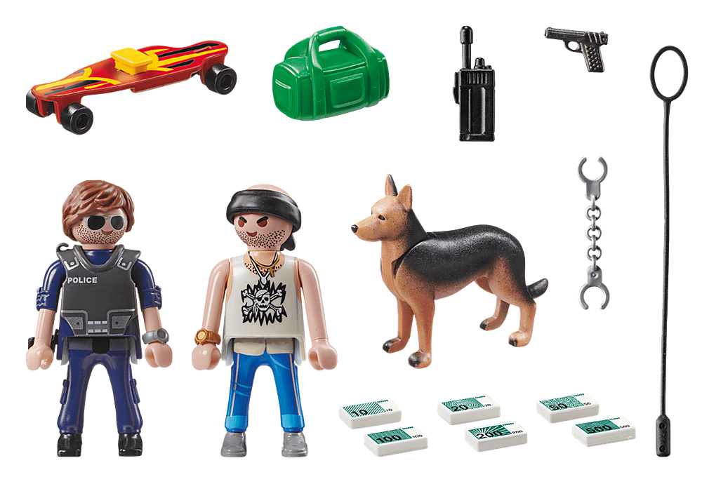 Le bandit s'échappe en skate, le chien du policier court à sa poursuite pour le rattraper. Contient un policier, un bandit, un chien et des accessoires.