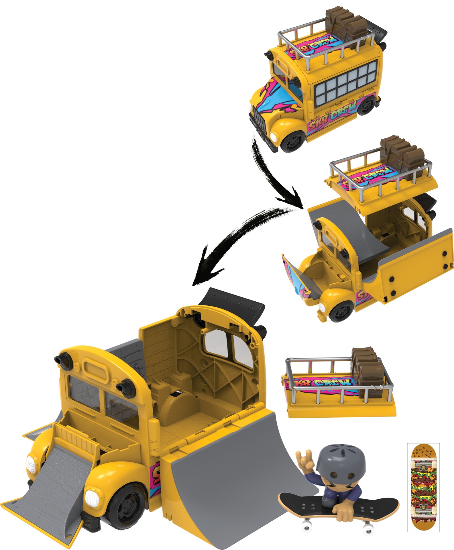 Un camion transformable en skate park complet avec 3 rampes et plusieurs configurations possibles. Comprend 1 finger skate et 1 personnage Sk8 Crew. Dès 5 ans.