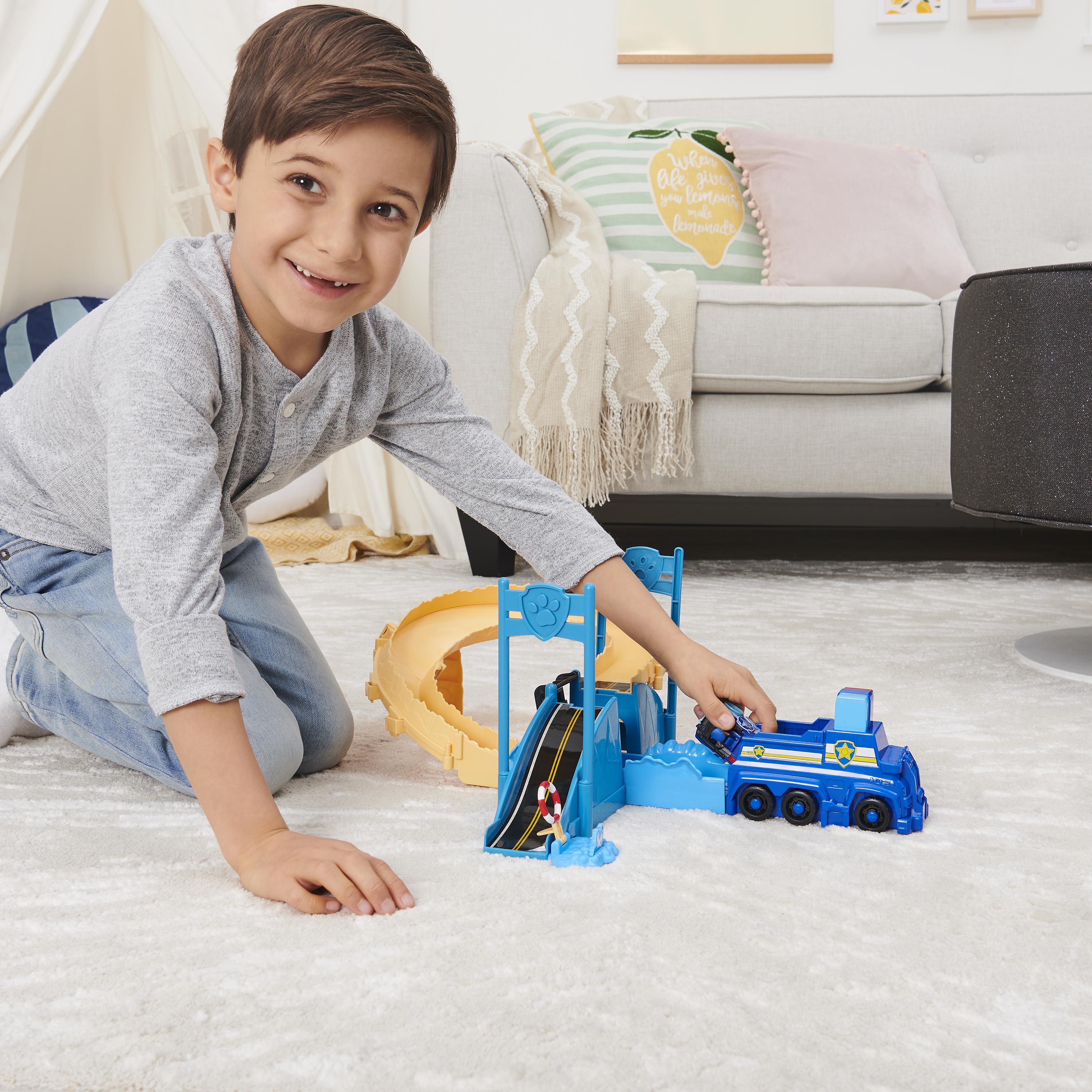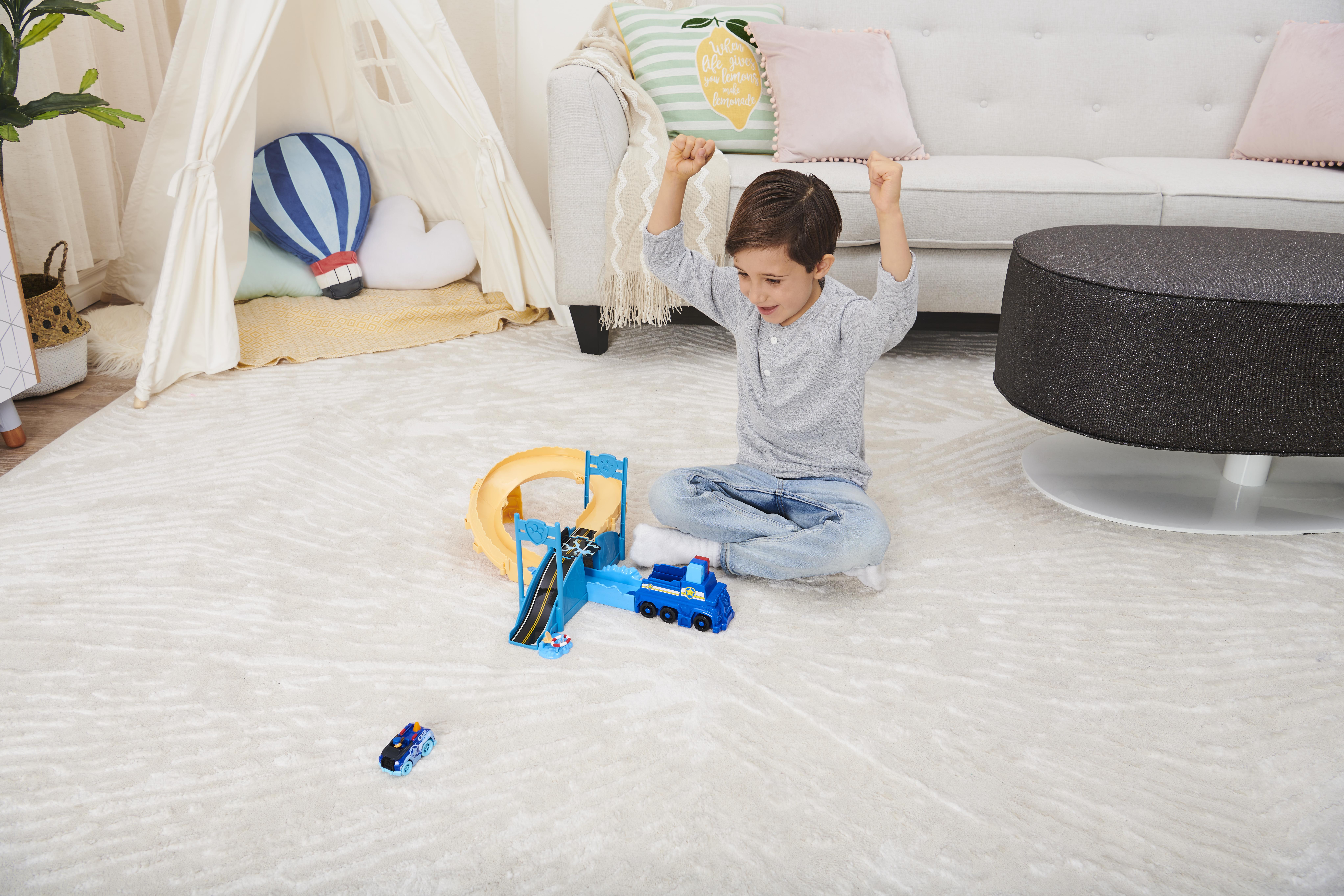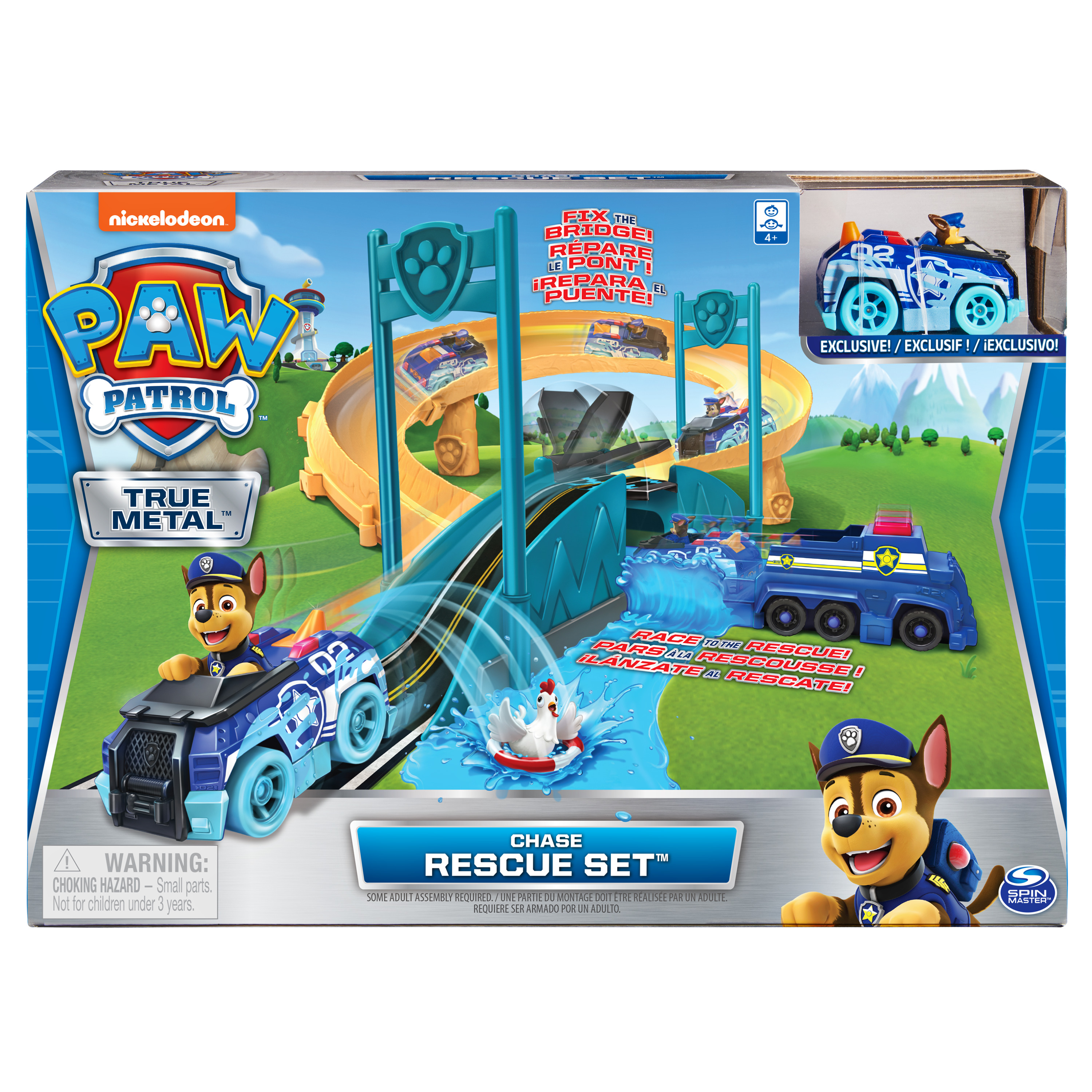 Contenu : 1 circuit, 1 lanceur de véhicules, 1 véhicule True Metal de Chase exclusif et 1 planche d'autocollants