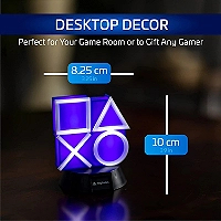 Petite lampe à lumière douce qui peut servir aussi bien de veilleuse que d'une lampe d'ambiance pour les adeptes de la console Playstation. Faite en PVC, la lampe reprend les symboles mythiques de la manette : croix, rond, carré, triangle et émet une lumière bleuté qui rappelle encore plus l'univers Playstation. Elle mesure 13,7 centimètre de hauteur sur une largeur de 10,7 centimètre et repose sur un socle noir et rond. Nécessite 2 piles AAA (Non incluses). Produit sous licence officielle Sony.