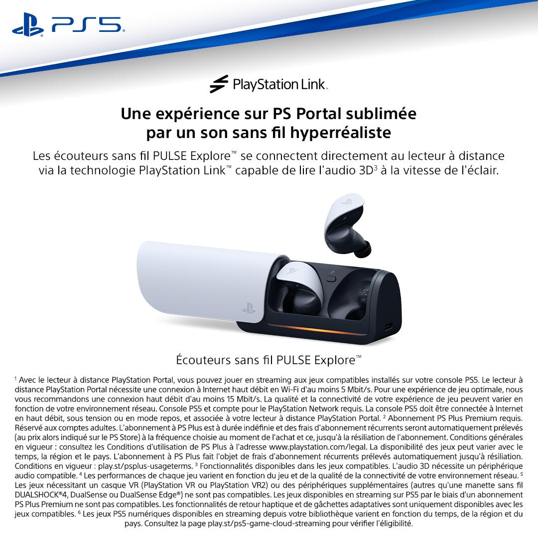 Plus-Produit : - Lecteur à distance PlayStation Portal - Cable USB - Notice d'Utilisation Depuis fin 2025, les membres PlayStation Plus Premium peuvent jouer en streaming aux jeux compatibles installés sur leur console PS5. Jouez à la PS5 via votre réseau Wi-Fi avec des commandes de qualité console grâce au lecteur à distance PlayStation Portal. Votre PS5 dans le creux de la main Le lecteur à distance PlayStation Portal vous donne accès aux jeux de votre console PS5 via votre réseau Wi-Fi. Jouez sur un somptueux écran LCD de 8 pouces capable d'afficher 60 images/seconde en 1080p sans téléviseur. Jouez à votre collection de jeux Le lecteur à distance PlayStation Portal peut lancer les jeux compatibles installés sur votre console PS5, notamment vos jeux favoris sur PS5 et PS4. Une immersion à couper le souffle grâce aux fonctionnalités de la manette sans fil DualSense Ressentez l'immersion incroyable du retour haptique et des gâchettes adaptatives dans les jeux compatibles.