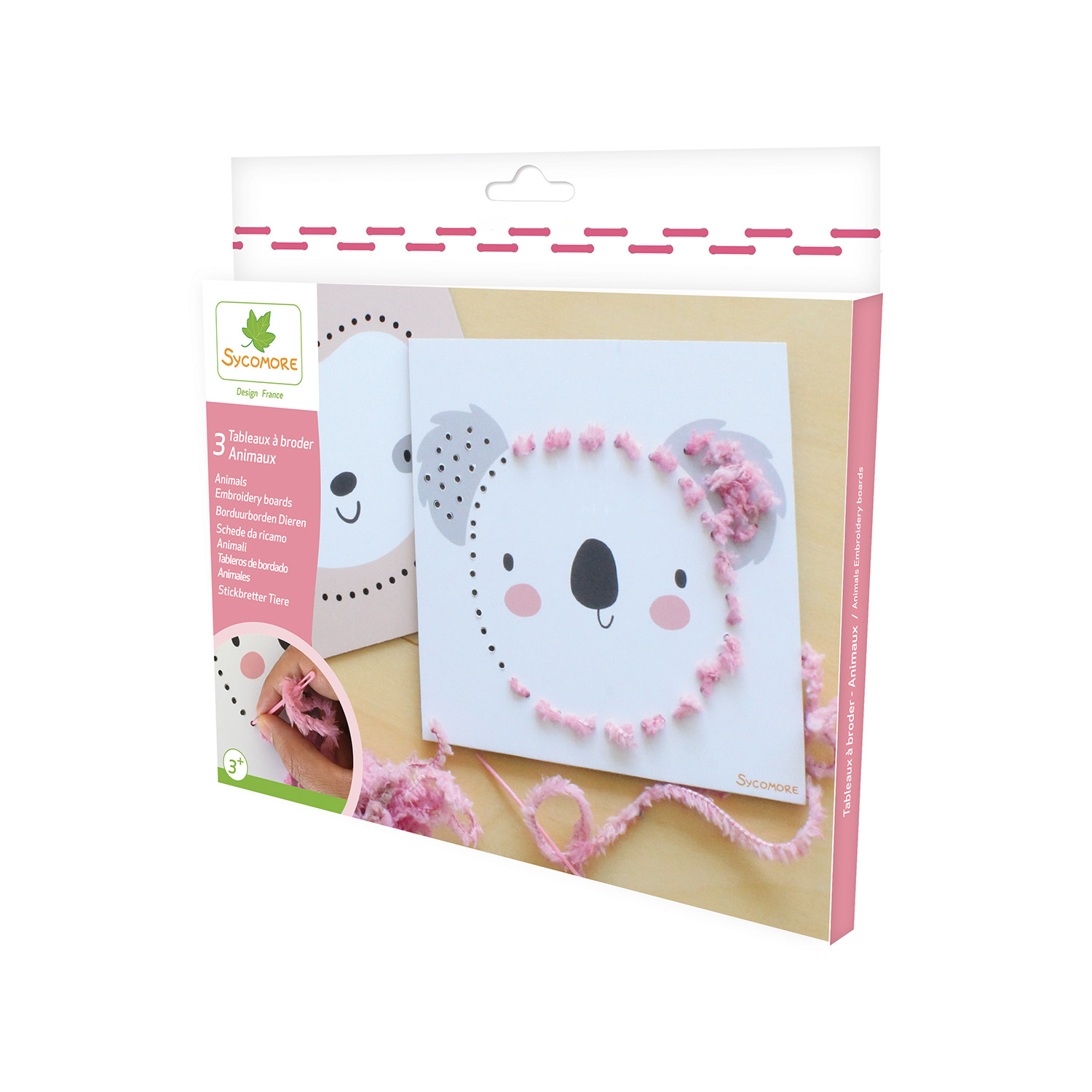 3 tableaux animaux à broder avec différentes laines texturées, livré avec 1 aiguille plastique et une notice.