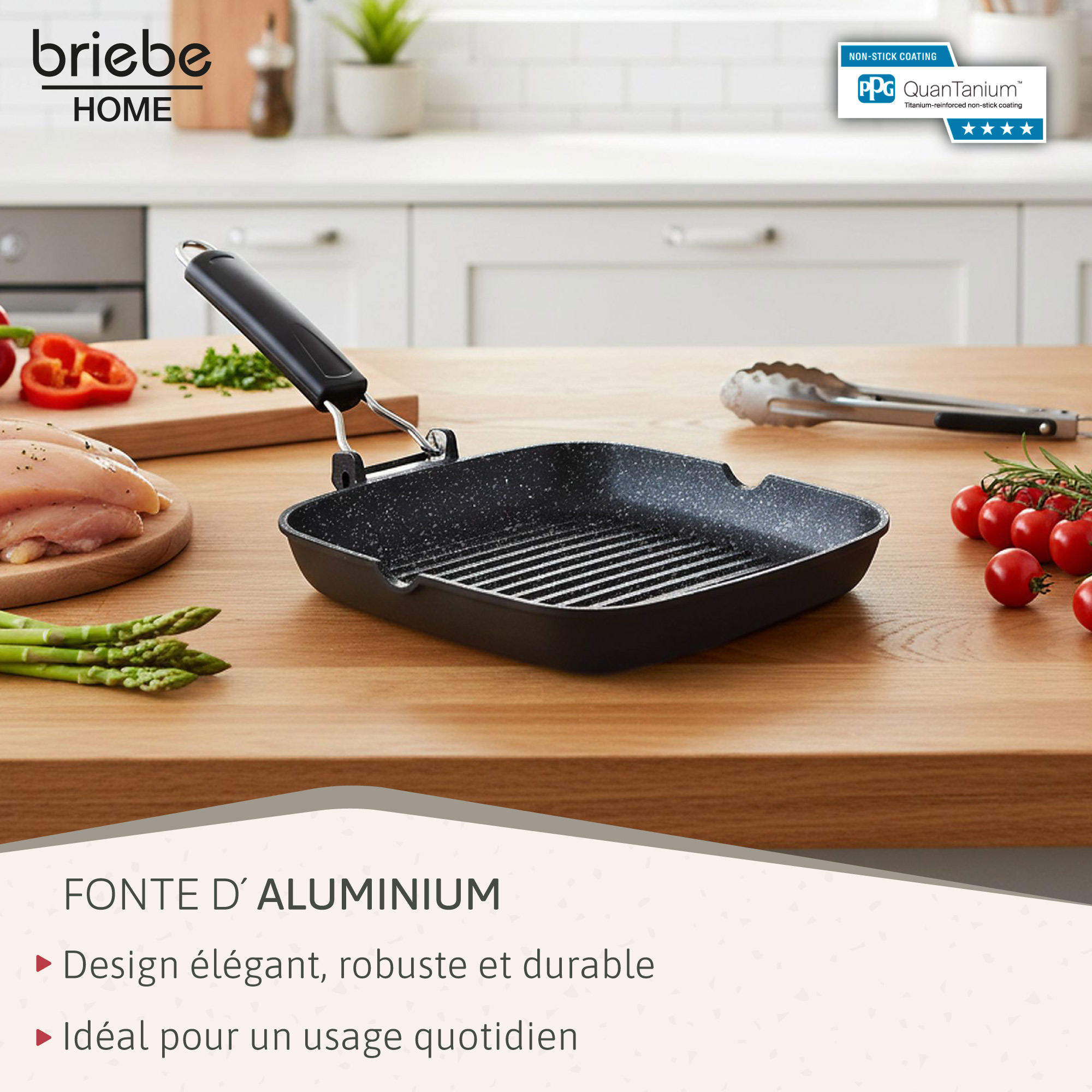 • Fonte d'Aluminium: Poêle grill antiadhésive de 24 x 24 cm, fabriquée en aluminium moulé. Elle offre un design innovant et élégant avec un revêtement extérieur noir intégral et un intérieur moucheté blanc façon pierre, d'un haut niveau de finition. Elle est légère mais très résistante aux abrasions et aux rayures.