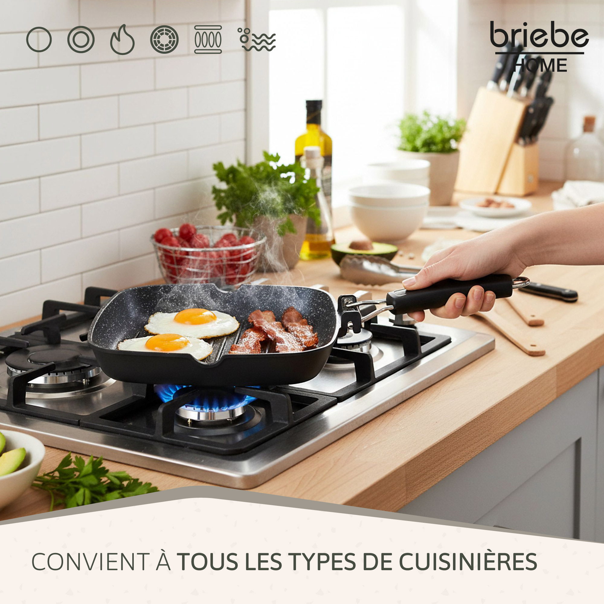Poêle à Griller Induction Antiadhésif Titane 24x24cm Fonte d'Aluminium sans PFOA Noir Briebe GP1158
