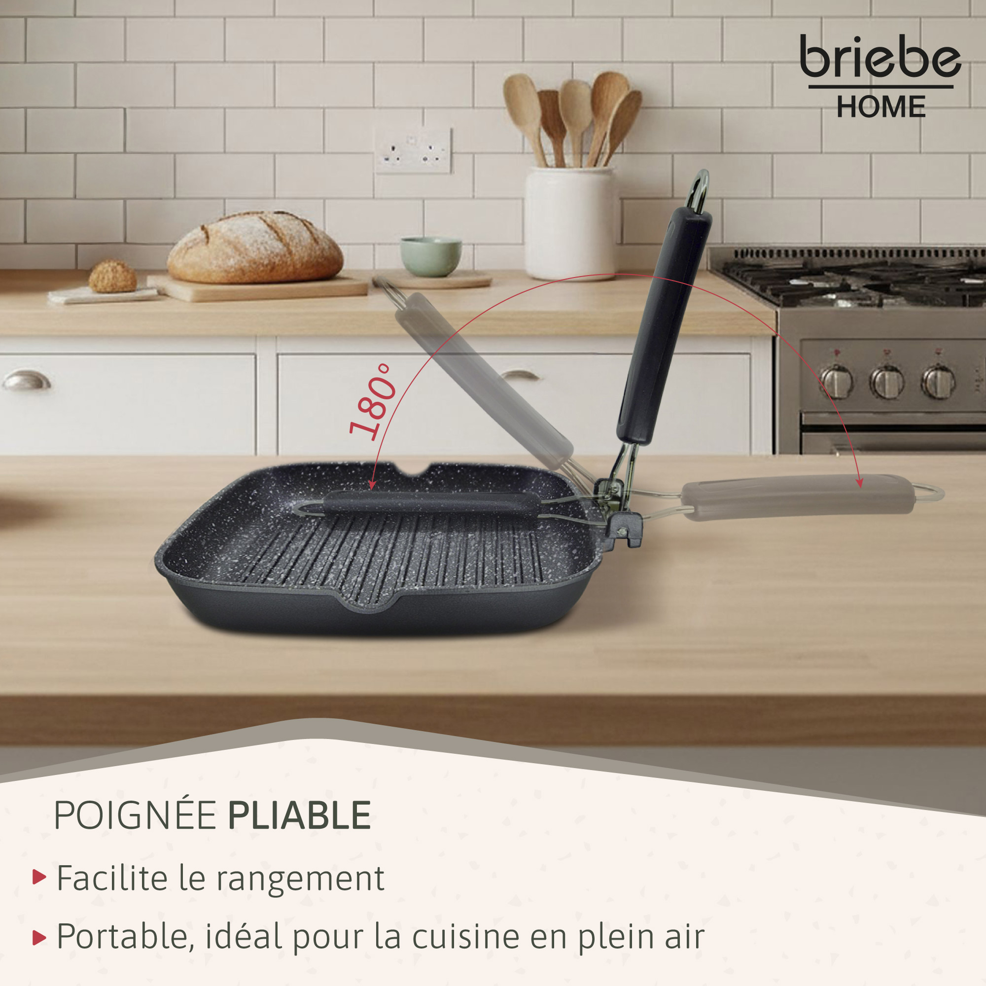 • Manche pliable: Son design pratique avec manche pliable facilite son rangement, idéal pour les petites cuisines avec peu d'espace, ou pour l'emporter lors de vos sorties en plein air ou au camping.