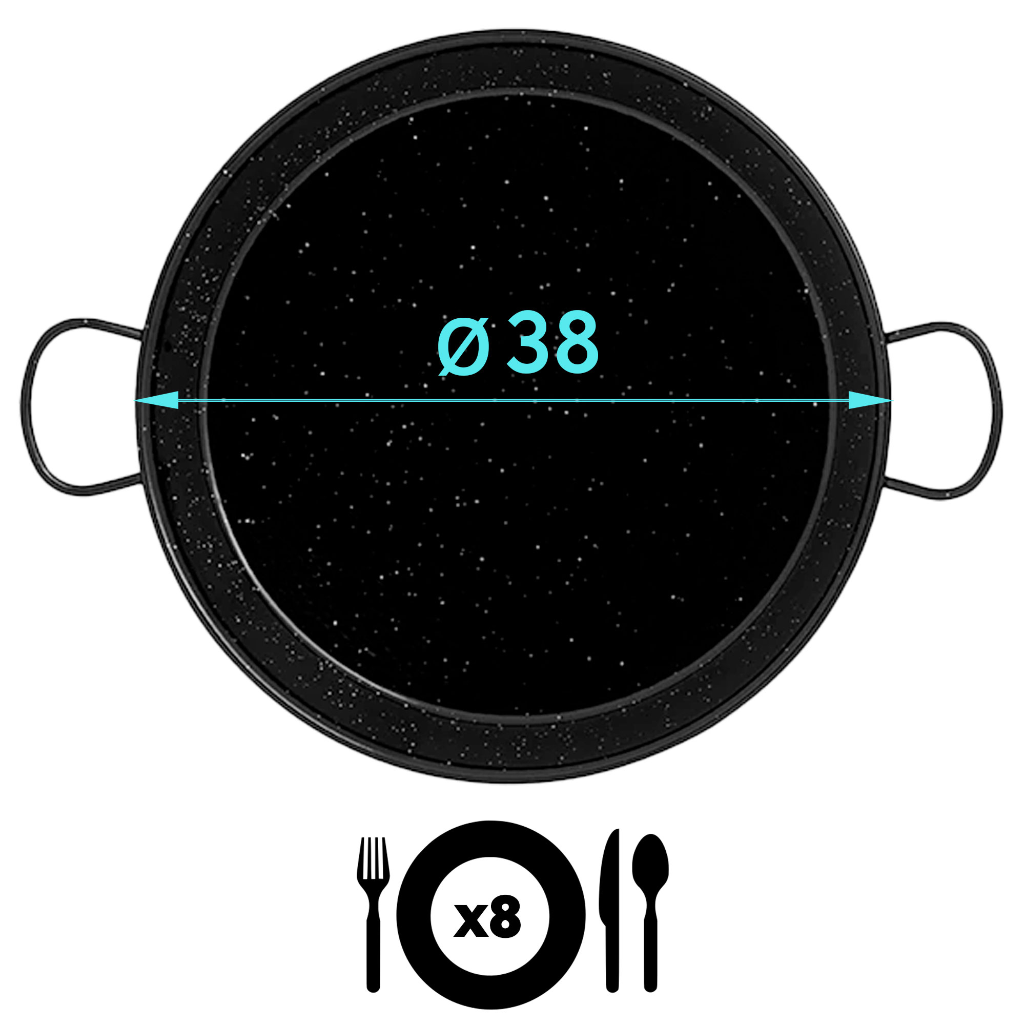 - Diamètre de 38 cm : Profitez de moments mémorables en partageant de délicieuses paellas avec vos amis et vos proches. Avec la poêle de 38 cm de diamètre, vous pouvez cuisiner jusqu'à 8 portions de toutes sortes de plats à base de riz, de risottos, de riz en bouillon, etc.