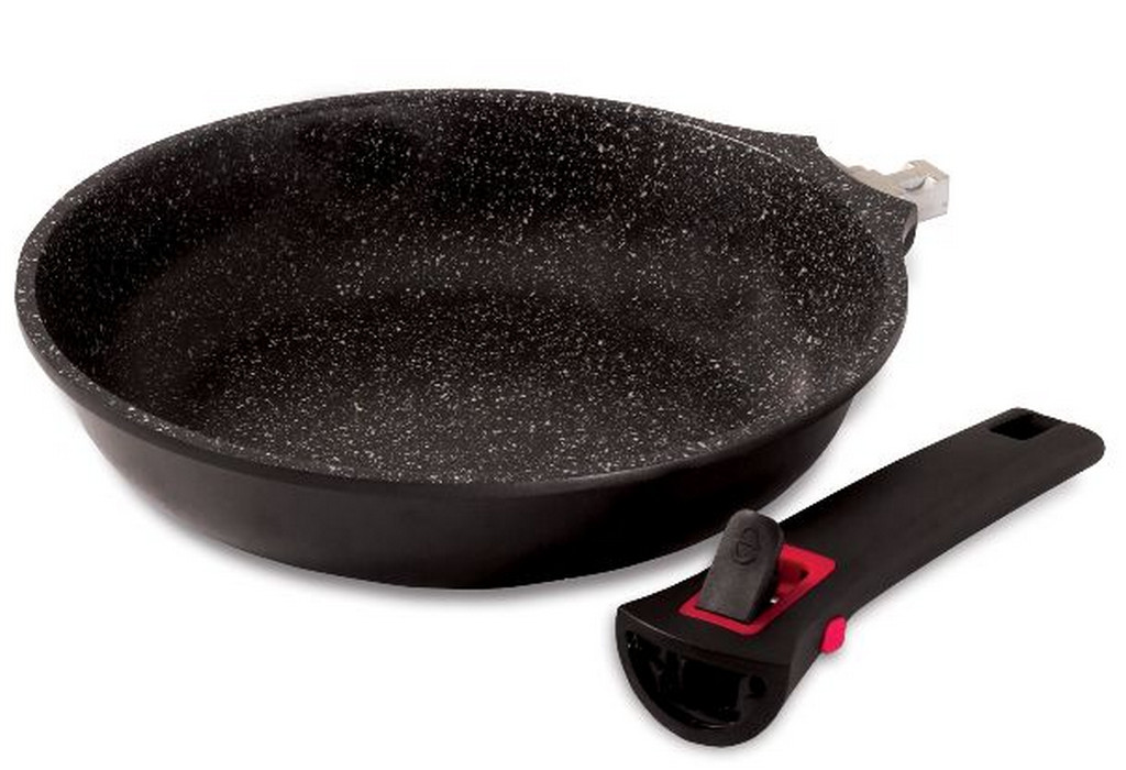 383600 - poêle antiadhérent 20cm - Granit Pro BAUMALU 383600. Une gamme complète d'ustensiles de cuisson pour une cuisine saine : sans ou avec très peu de matière grasse! Accessoires amovibles pour un rangement compact et un gain de place dans vos placards. En fonte d'aluminium pour une diffusion homogène de la chaleur et une cuisson uniforme. Revêtement intérieur Whitford QuanTanium: un revêtement anti-adhérent 3 couches renforcées avec du Titane. Un revêtement ultra-résistant et durable! Livrée avec 1 manche amovible en bakélite. Le manche se clipse facilement et se verrouille en appuyant sur le loquet noir de la poignée. Il s'enlève tout aussi facilement en appuyant sur le bouton rouge sur le coté de la poignée. Nettoyage facile: passe au lave-vaisselle (sans poignées et manche). Extérieur Noir. Tous feux dont induction. - Diamètre : 20 cm.