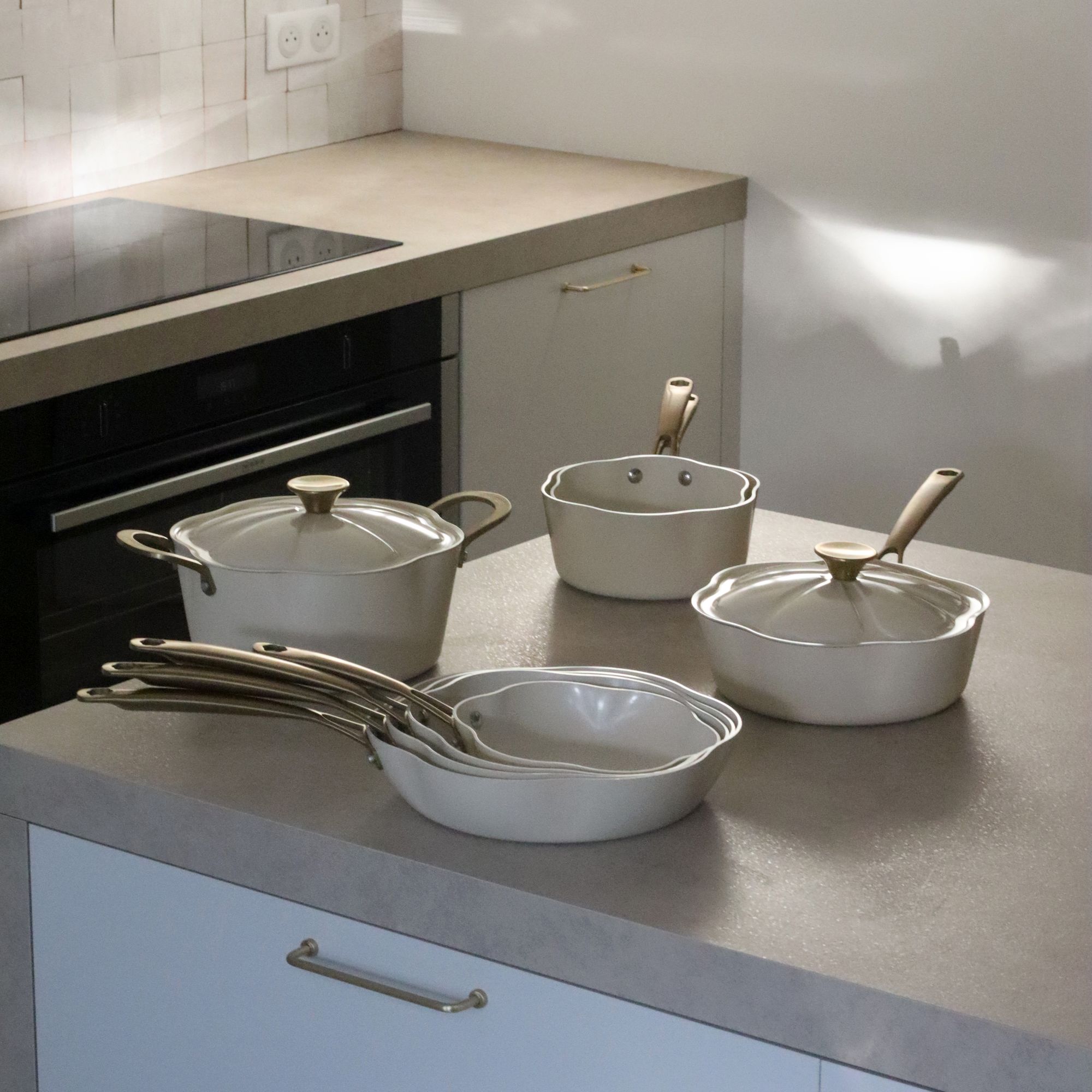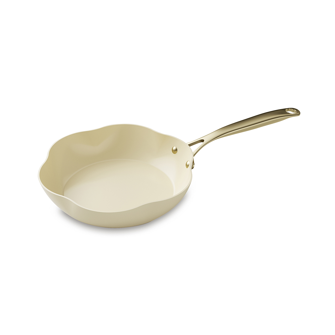 98% d'aluminium 2.5mm recyclé Revêtement intérieur anti-adhésif en céramique 2 couches Poignée rivetée en acier inoxydable couleur or Compatible tous feux dont induction Notre gamme dahlia est une gamme performante, élégante et au design exceptionnel, elle deviendra l'indispensable pour cuisiner vos préparations ! Notre poêle se distingue par son design unique en forme de fleur. Conçue pour captiver les regards dans votre cuisine, elle ajoute une touche douce à votre espace de cuisson. Sa conception en aluminium favorise une diffusion homogène de la chaleur pour des cuissons optimales. Grâce à son revêtement antiadhésif, vos aliments n'accrochent pas et son nettoyage est facilité. Entretien : Compatible avec le lave vaisselle
