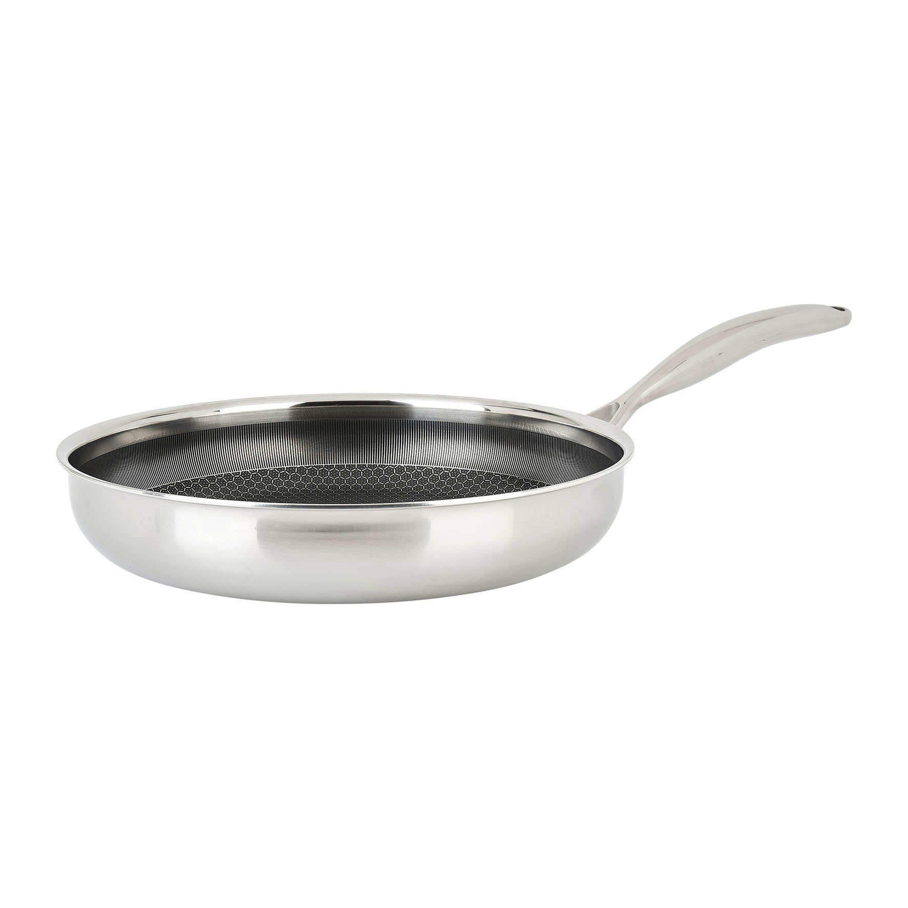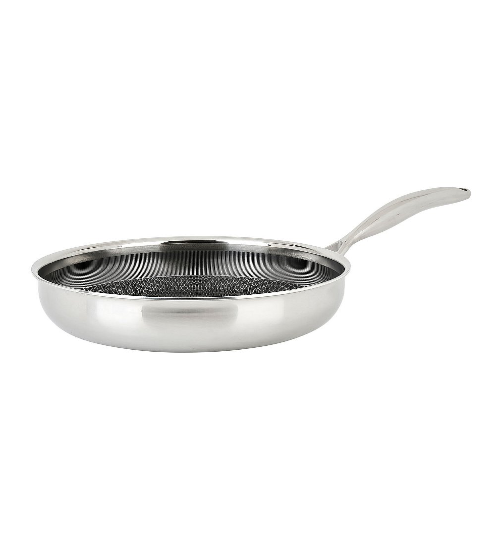 Poêle Inox Gamme CARACTERE Ø 30 cm H 6 cm Revêtement intérieur anti-adhésif Téflon Platinium 3 couches Avec manche en inox Epaisseur corps 2.5 mm tous feux dont induction