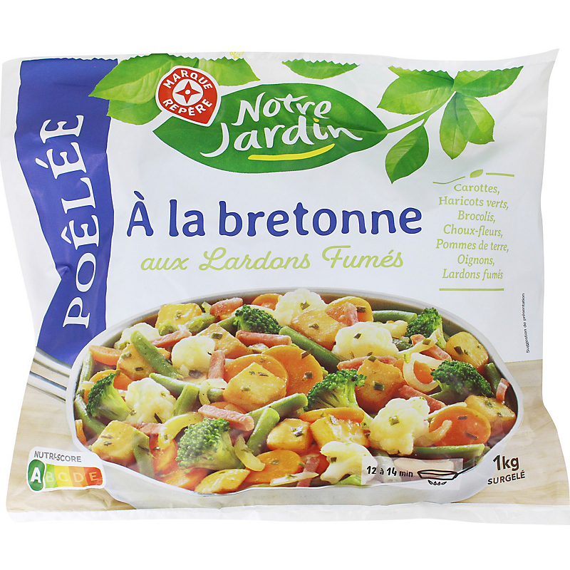 Ingrédients: Carottes 20 % ; haricots verts 18 % ; brocolis 17 % ; choux-fleurs 17 % ; pommes de terre préfrites 11 % (pommes de terre 10,5 %, huile de tournesol, dextrose) ; oignons préfrits 8 % (oignons 7 %, huile de tournesol) ; lardons fumés cuits 5 % (viande de porc, sel, dextrose, antioxydant : ascorbate de sodium, arôme naturel, conservateur : E250) ; huile de colza ; beurre concentré ; ciboulette en poudre ; eau ; bouillon de légumes 0,3 % (sel, sucre, oignons en poudre, carottes en poudre, tomates en poudre, huile de tournesol) ; sel ; poudre d'ail.
