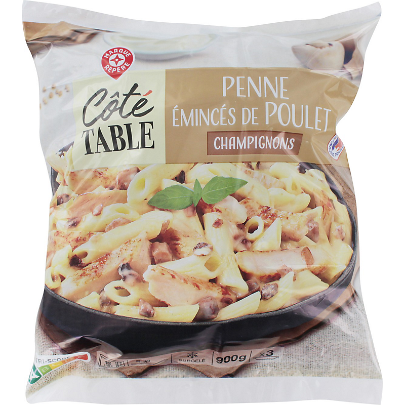 Mélange de pâtes alimentaires, de morceaux de poulet traité en salaison et de champignons, sauce à base de crème (27,7 %), surgelé COTE TABLE
