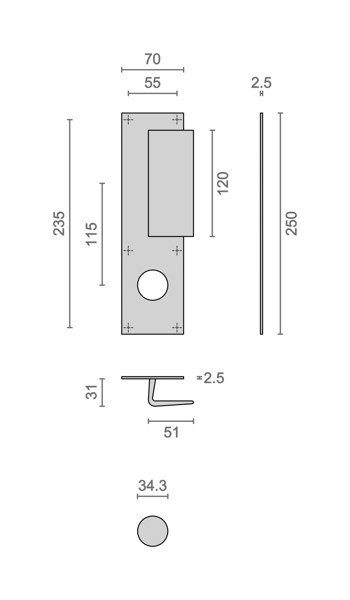 | Libellé | Poignée palière aluminium type Bastille 70x250mm argent trou de 34 - HERACLES - I-231103TR34 |