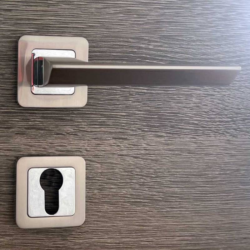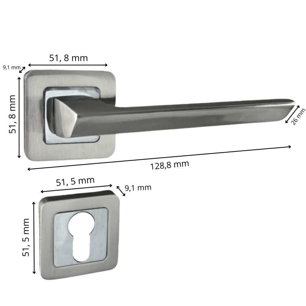 Paire de poignées de porte chromées et satinées sur rosaces carrées au bouts arrondis