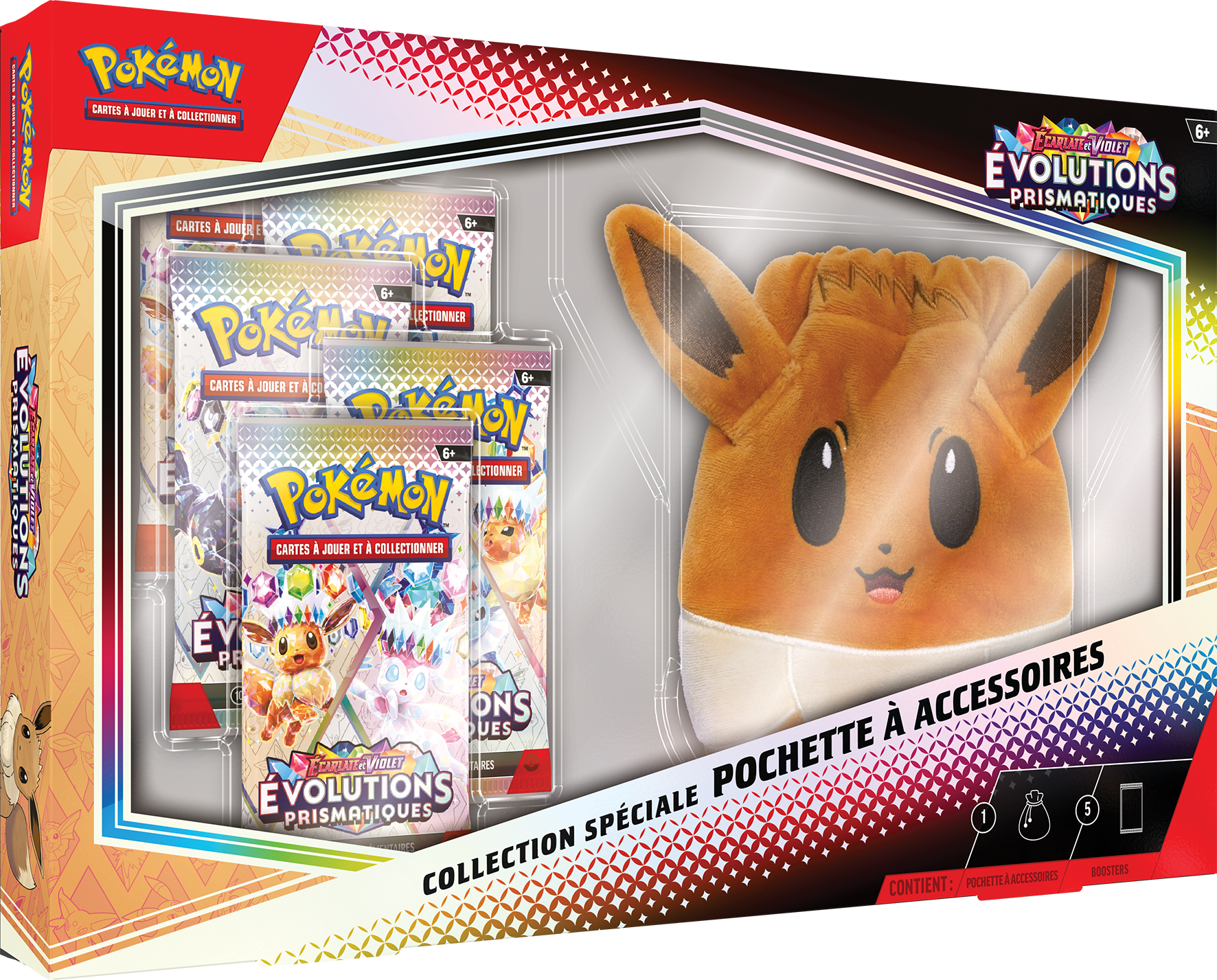 Une pochette à accessoires amusante à l’effigie d’Évoli, 5 boosters Écarlate et Violet – Évolutions Prismatiques du JCC Pokémon