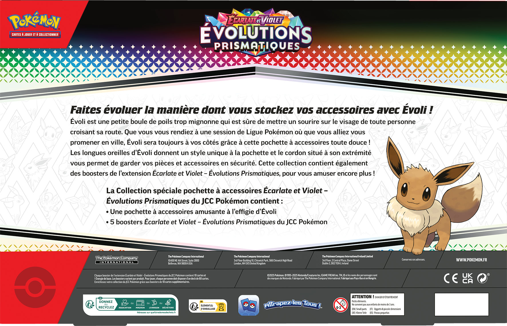 Une pochette à accessoires amusante à l’effigie d’Évoli, 5 boosters Écarlate et Violet – Évolutions Prismatiques du JCC Pokémon