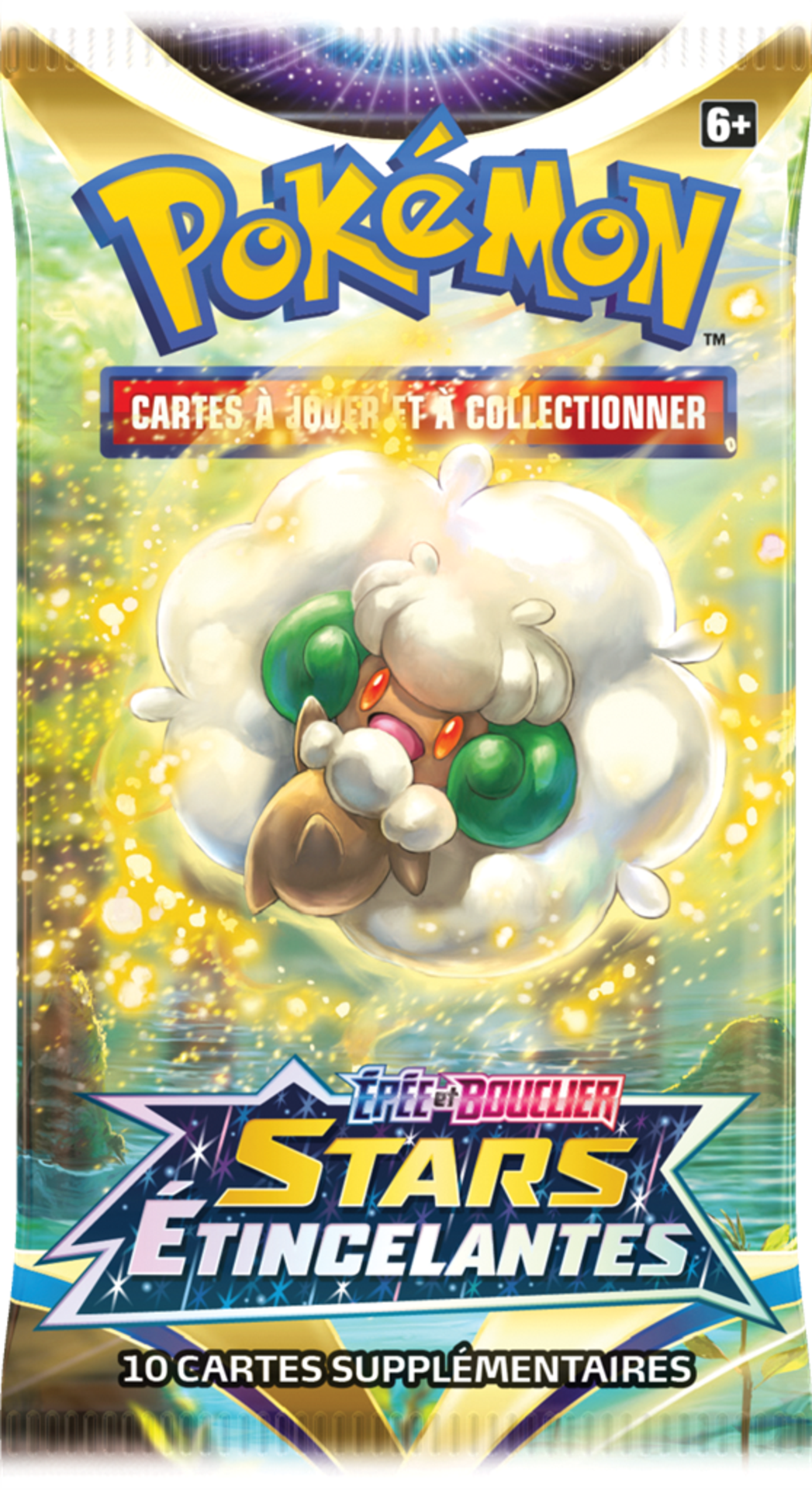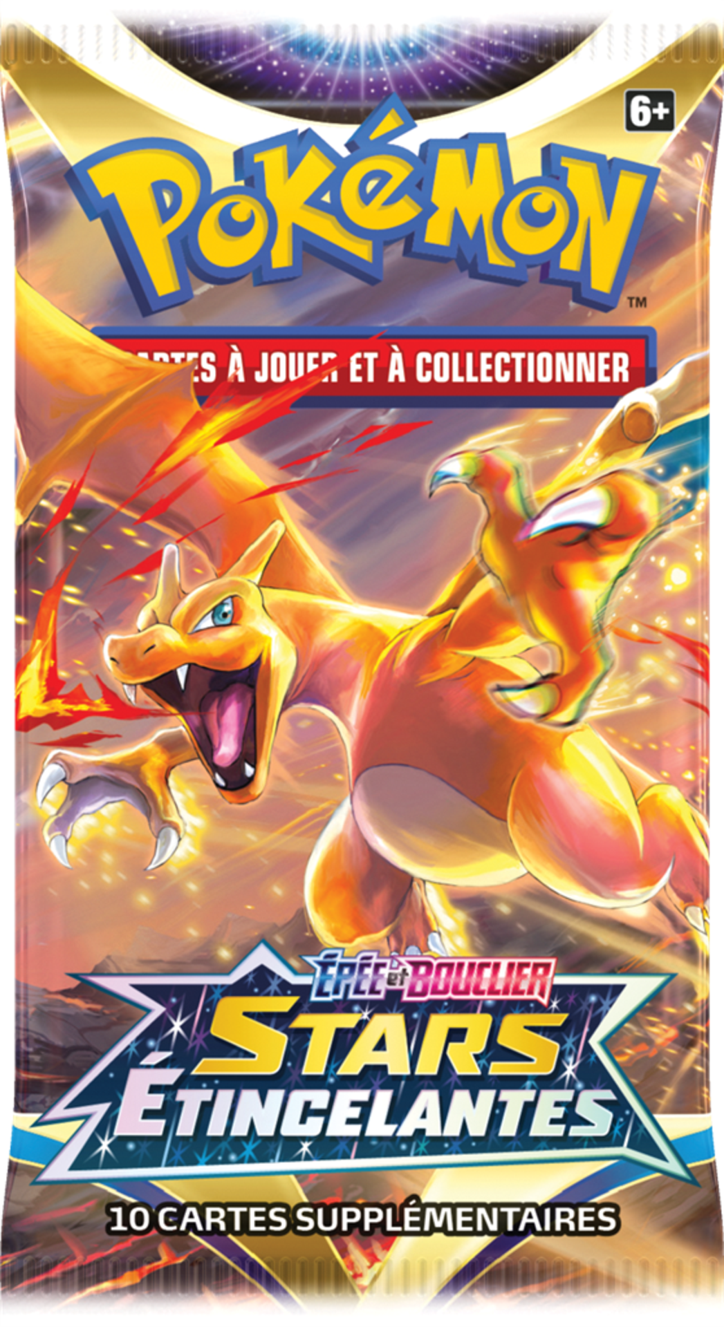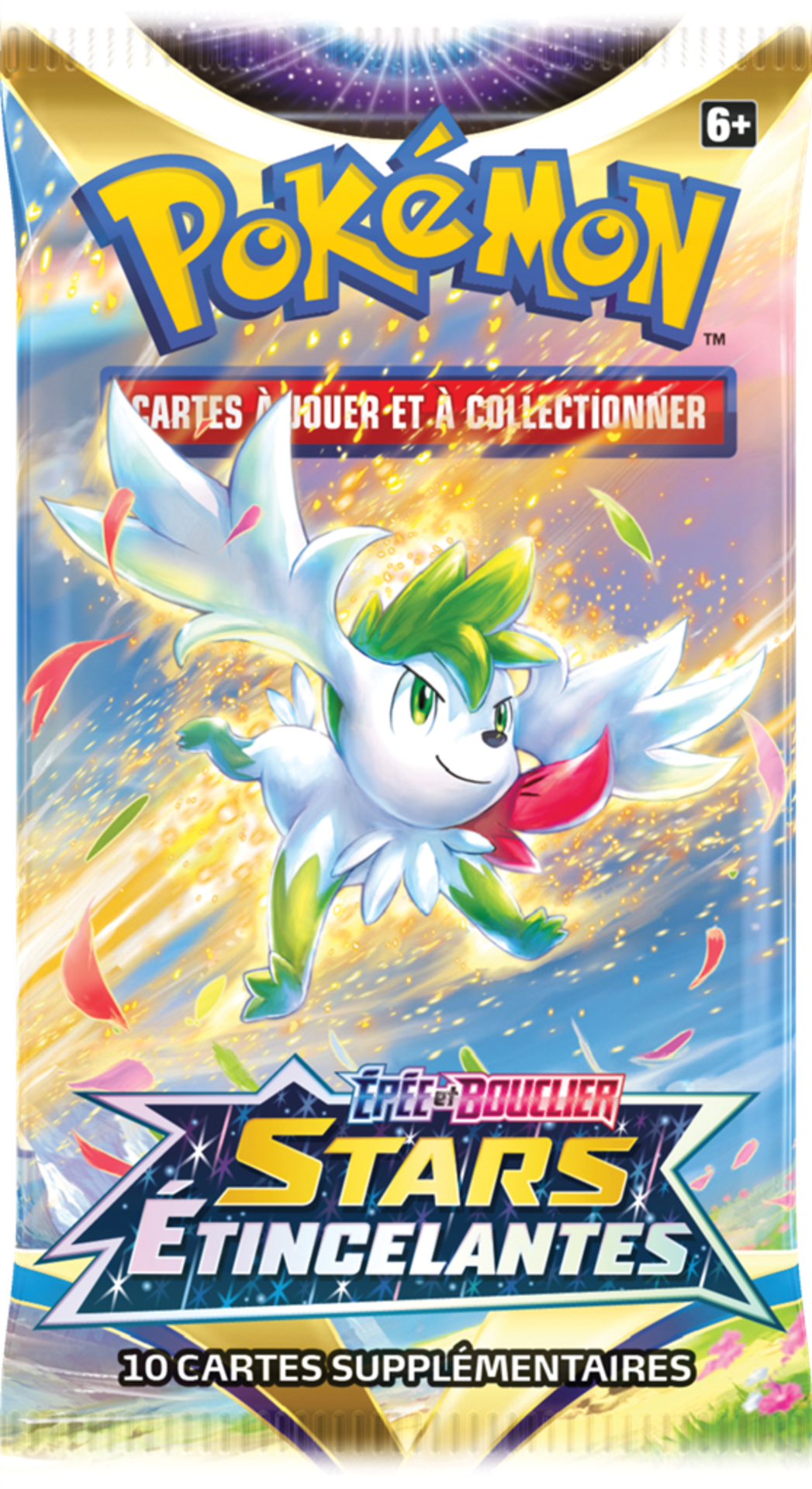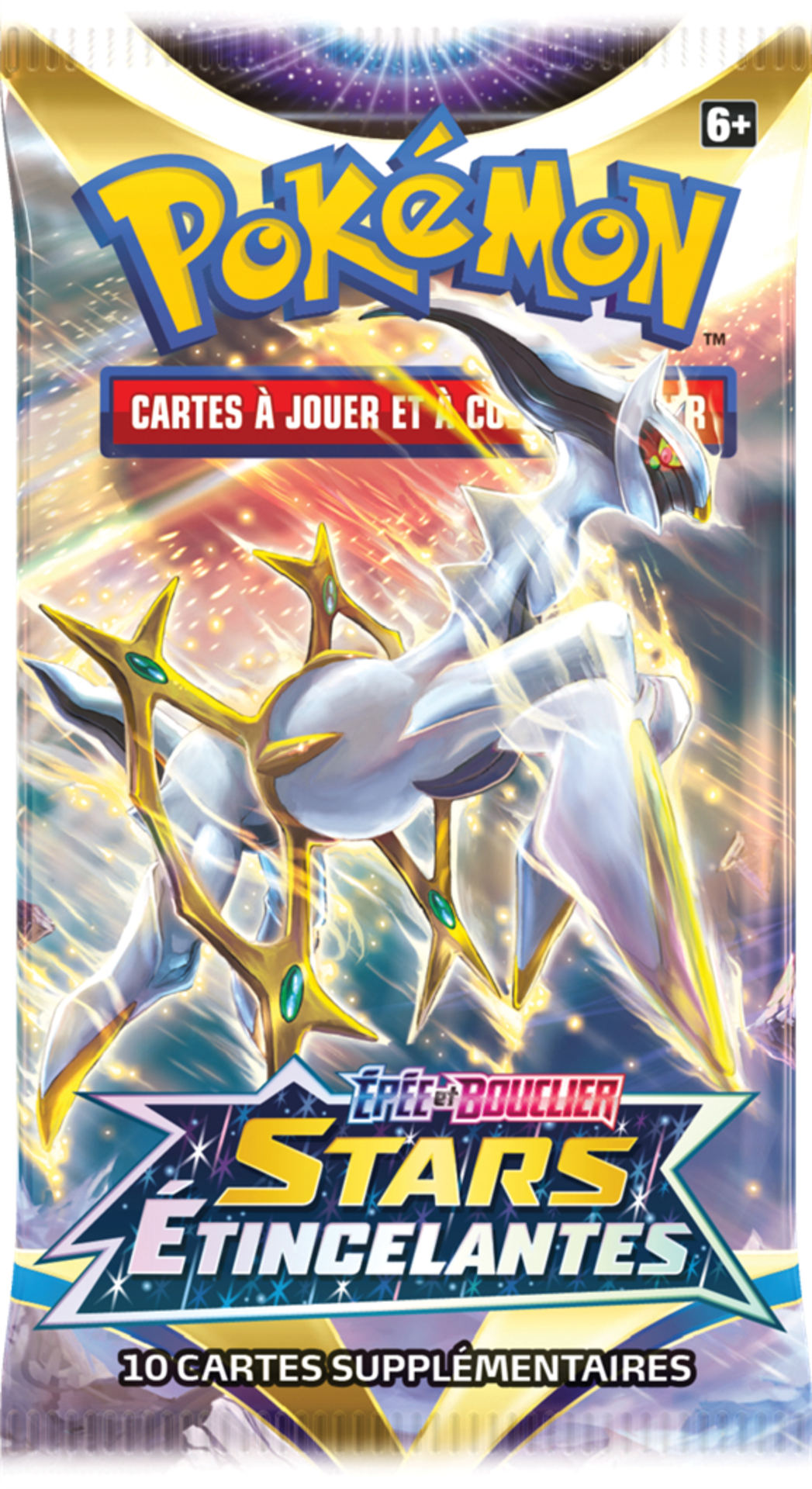 Booster de 10 cartes. Débordant de lumière, Arceus-VSTAR descend des cieux pour partager ses pouvoirs célestes avec d'autres Pokémon-V. Découvrez des constellations scintillantes et commencez votre voyage vers la grandeur stellaire avec l'extension Épée et Bouclier – Stars Étincelantes du JCC Pokémon.