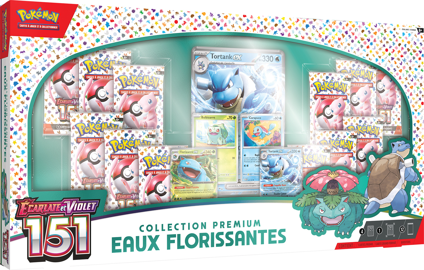 La Collection Premium Eaux Florissantes du JCC Pokémon contient : 4 cartes brillantes de Florizarre-ex, Tortank-ex, Bulbizarre et Carapuce, 1 carte grand format brillante de Tortank-ex, 12 boosters du JCC Pokémon, 1 carte à code pour le JCC Pokémon Live