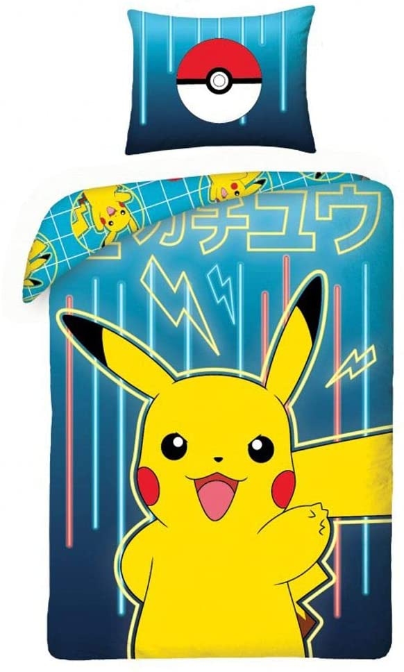 Pokemon - Parure de Lit Enfant Coton Pikachu Neon - Housse de Couette 140x200 Taie d'Oreiller 65x65 cm