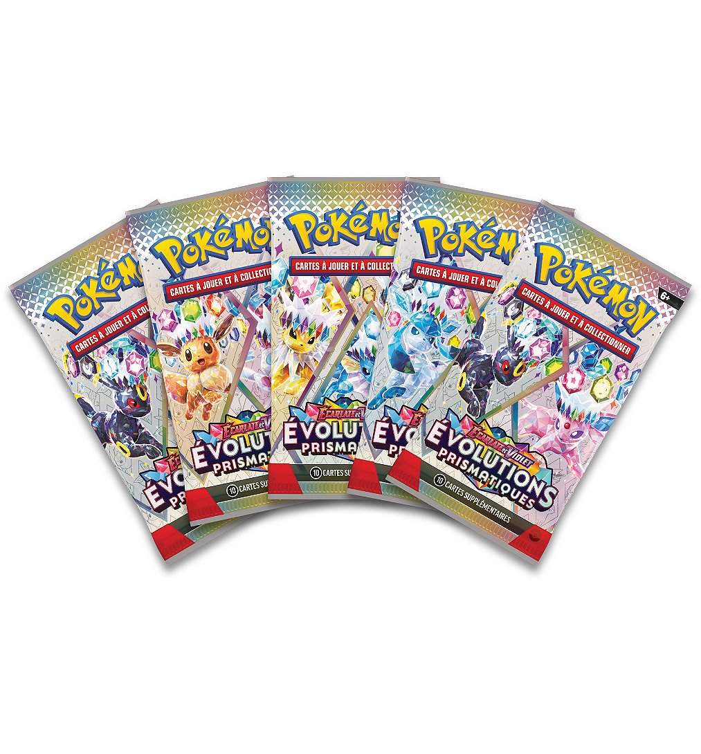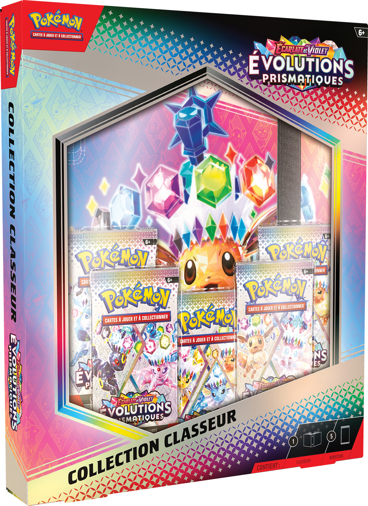 Classeur à 9 pochettes par page, pour ranger jusqu'à 378 cartes du JCC Pokémon. Cette collection comprend également 5 boosters de l'extension Ecarlate et Violet - Evolutions Prismatiques