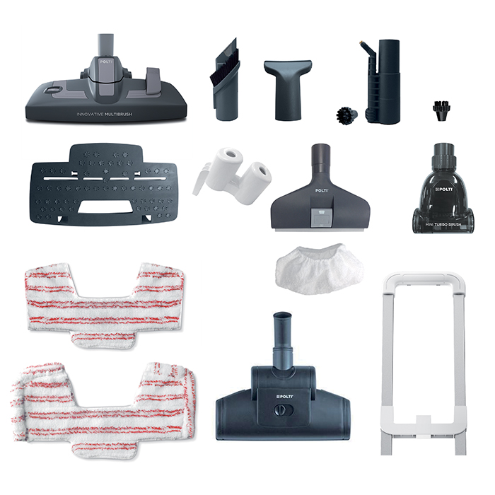 | Accessoires inclus | -Brosse Multibrush -Brosse Turbo pour sols -Mini brosse Turbo -Brosse 2 en 1 pour vitres et tissus -Lance 2 en 1 -Embout aspiration -Concentrateur de vapeur -Petite brosse avec poils en nylon -Bonnette pour brosse 2 en 1 -Poignée verticale -Accessoire parquet -Serpillières lavables en microfibre -Porte-accessoires -Tube télescopique -Tube flexible avec système clip |