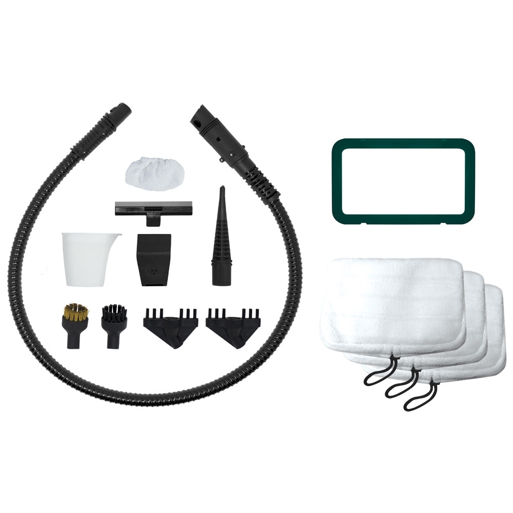 | Accessoires inclus | -Cadre pour tapis -Raclette lave-vitres -Lance vapeur -Brosses pour joints -Petite brosse ronde avec poils en nylon -Accessoire pour tissus d'ameublement -Bonnette -3 serpillières pour le sol -Tuyau vapeur flexible -Petite brosse ronde aux poils en laiton -Carafe |
