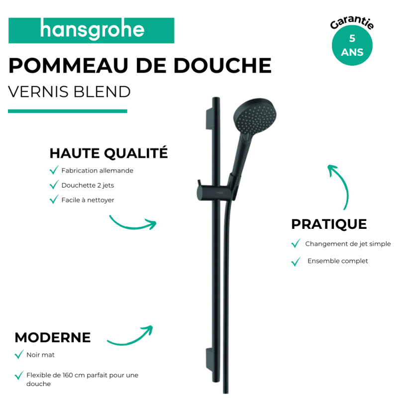 Les avantages du pommeau de douche HANSGROHE Vernis Blend 2 jets barre + flexible noir mat