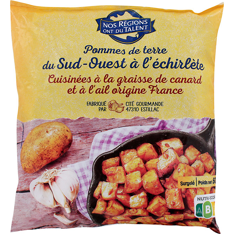 Morceaux de pommes de terre préfrits, enrobés à la graisse de canard et à l'ail, surgelés NOS REGIONS ONT DU TALENT