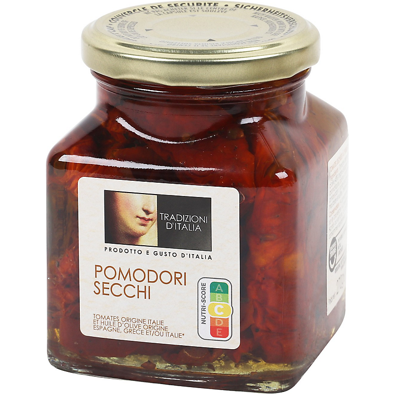 Ingrédients : Huile d'olive 48,1 %, tomates séchées réhydratées 47,1 %, sel, plantes aromatiques, poivre, correcteur d’acidité : acide citrique, antioxydant : acide ascorbique.