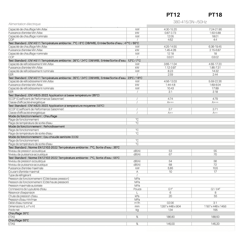 | Libellé | Pompe à Chaleur Air/Eau Triphasé 18 kW Monobloc - Connectée avec Appoints Électriques et Gaz R290 - |