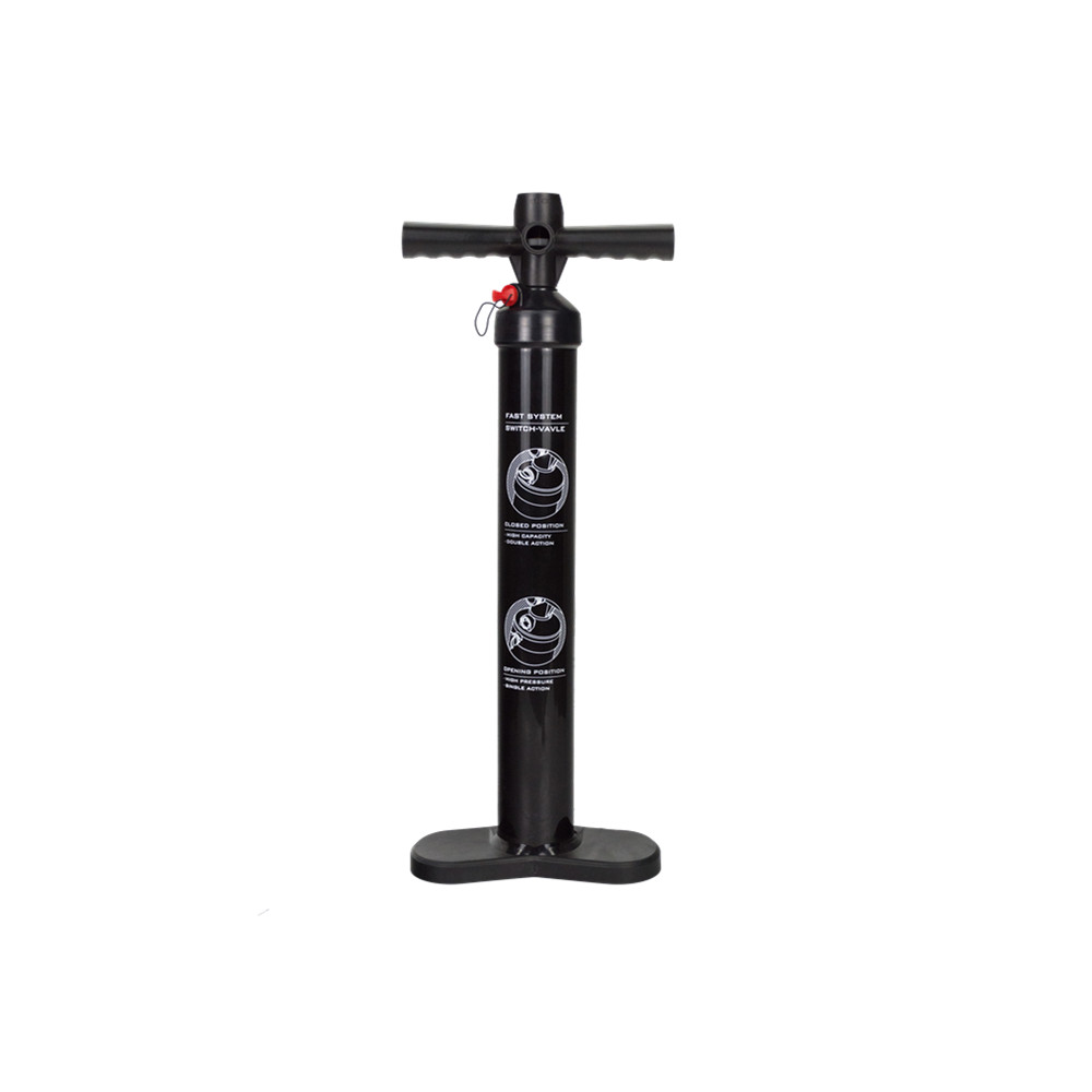 Pompe Universelle pour Stand Up Paddle Gonflable. Cette pompe possède un manomètre précis de 7 à 25 Psi, parfait pour gonfler son paddle avec précision. Le gonflage s'effectue efficacement et sans effort. Cette pompe convient pour tous les paddles grâce à son embout universel. Elle est également double action, ce qui signifie que vous gonflerez autant en pression qu'en détente. Cette pompe peut aussi être passée en simple action facilement, en dévissant une molette. Cela est très pratique lorsque votre paddle sera presque à sa pression nominale, vous forcerez nettement moins en simple action. Caractéristiques : Poids : 1,15 Kg, Dimensions : 28 x 9 x 62cm, Longueur du tuyau : 127 cm, Volume : 1,8L, Diamètre du tuyau de la pompe : 2.5 cm
