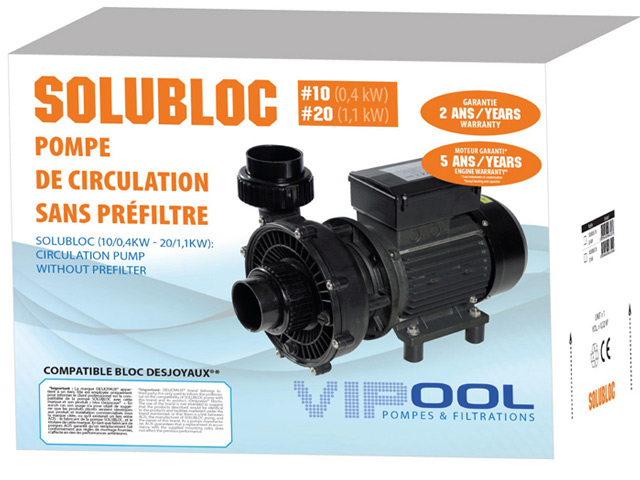 Pompe filtration 5m³/h Solubloc 20 compatible Desjoyaux P25. Utilisation en bloc fermé, moteur résistant aux hautes températures. Fabrication française, compatible traitement sel et eau de mer. 100% compatible avec les blocs de filtration...