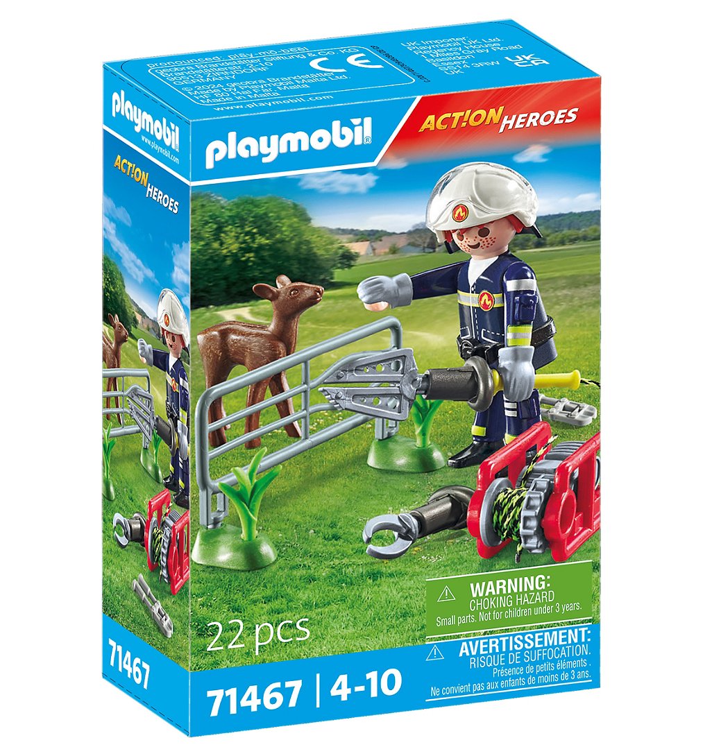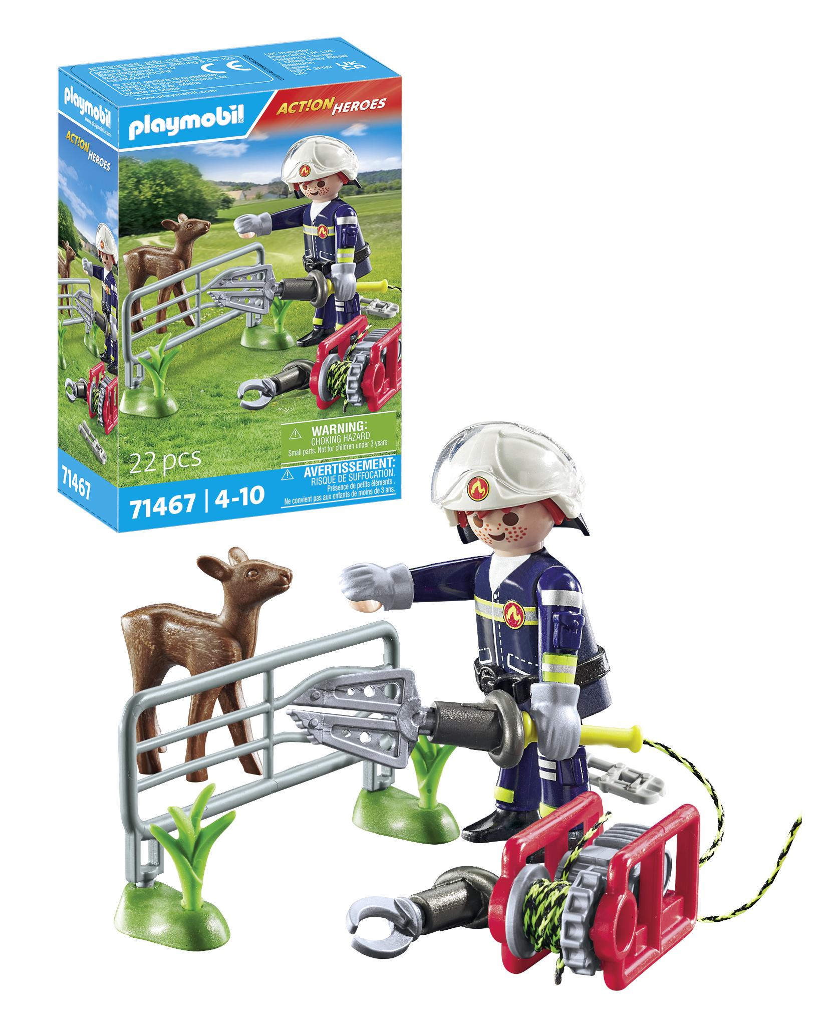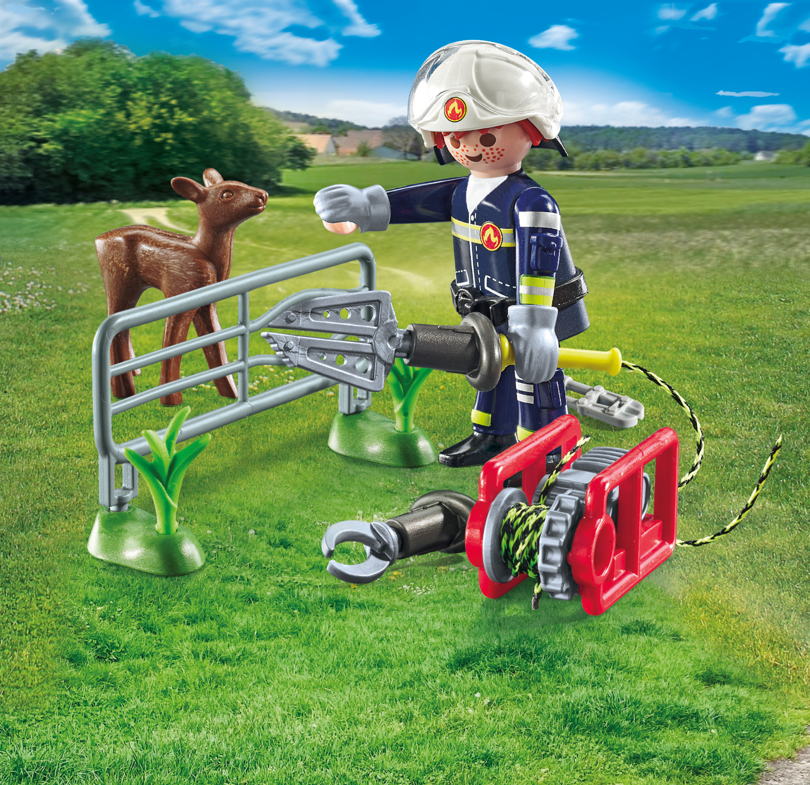 Appel d'urgence à la caserne des pompiers ! Comprend un personnage, un faon prit dans une clôture, une plaque d'appui, une cisaille de sauvetage et l'écarteur.